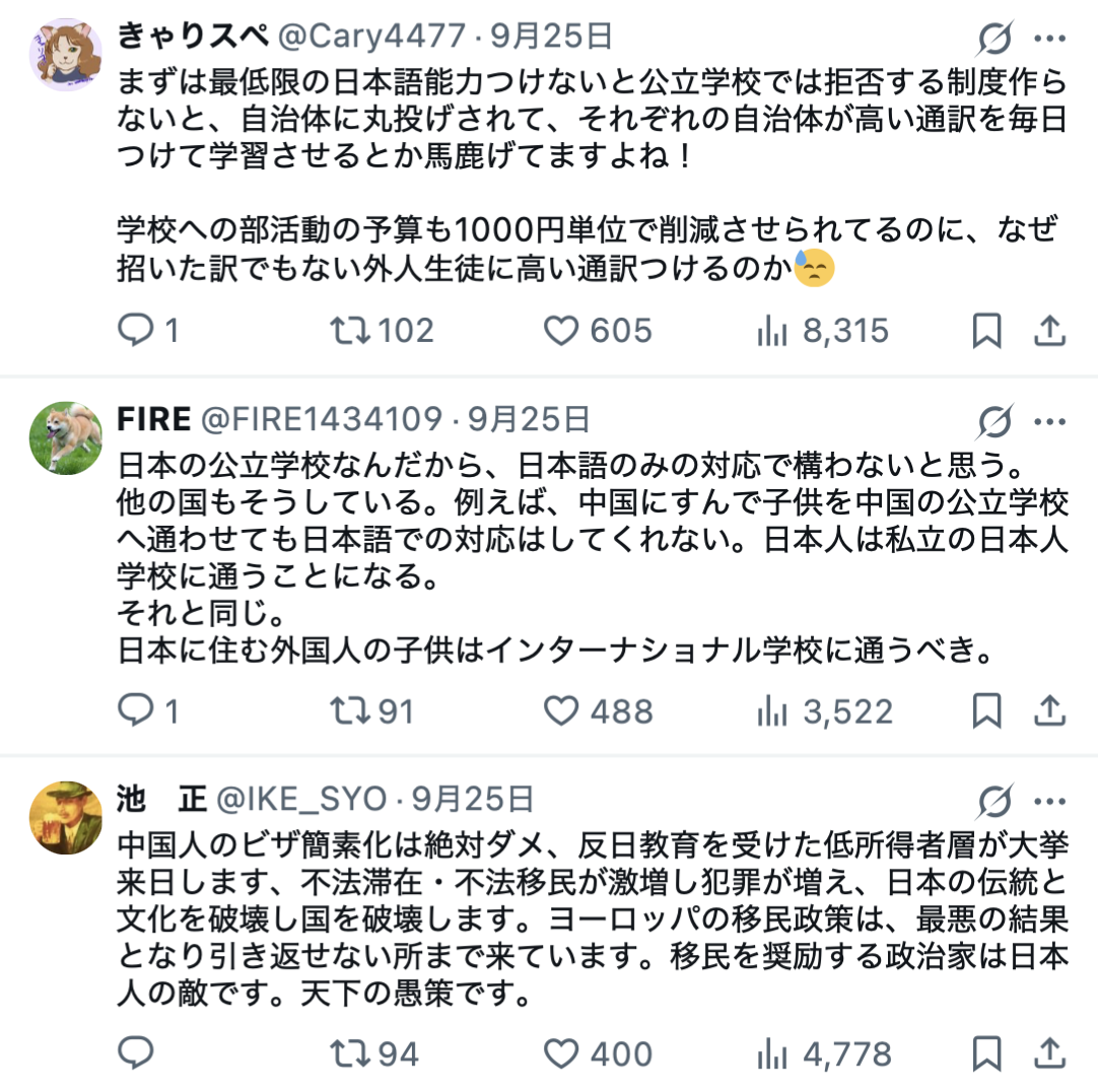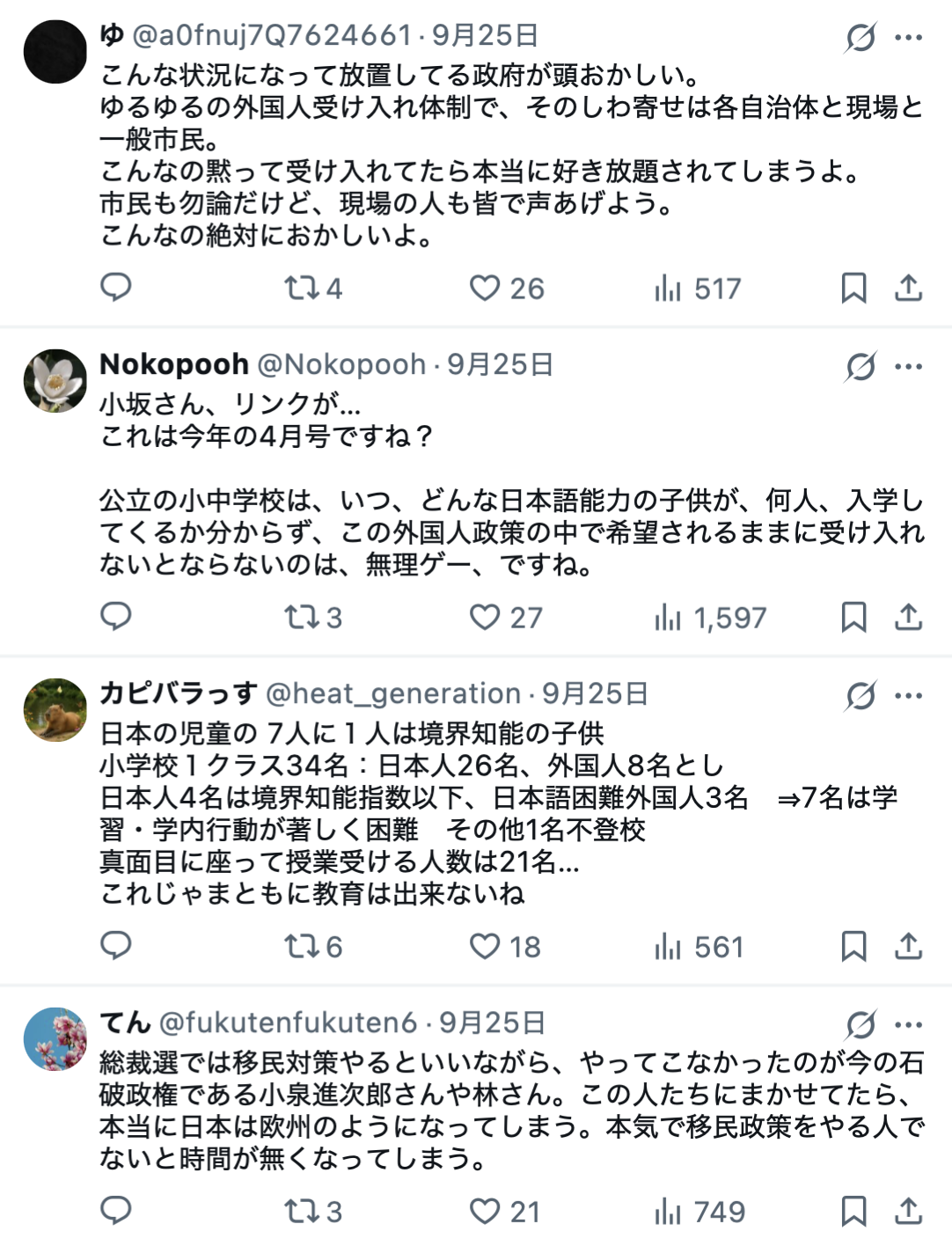 こうした状況の中、自民党の木田区議らは外国籍の児童への支援の必要性を訴えていますが、その一方でネット上では、外国籍児童への対応に注力することで日本人児童への教育が疎かになるといった懸念の声が上がっており、「日本人の生徒が可哀そうすぎ」「これは移民問題で一番不味い状況じゃないかな。 移民2世は将来の破局的リスク要因です」「日本語話せない。まして外国籍の子供を公立学校で国民の税金で面倒みるっておかしくないですか?」など、外国籍児童を際限なく受け入れる制度そのものを問題視する声も上がっています。