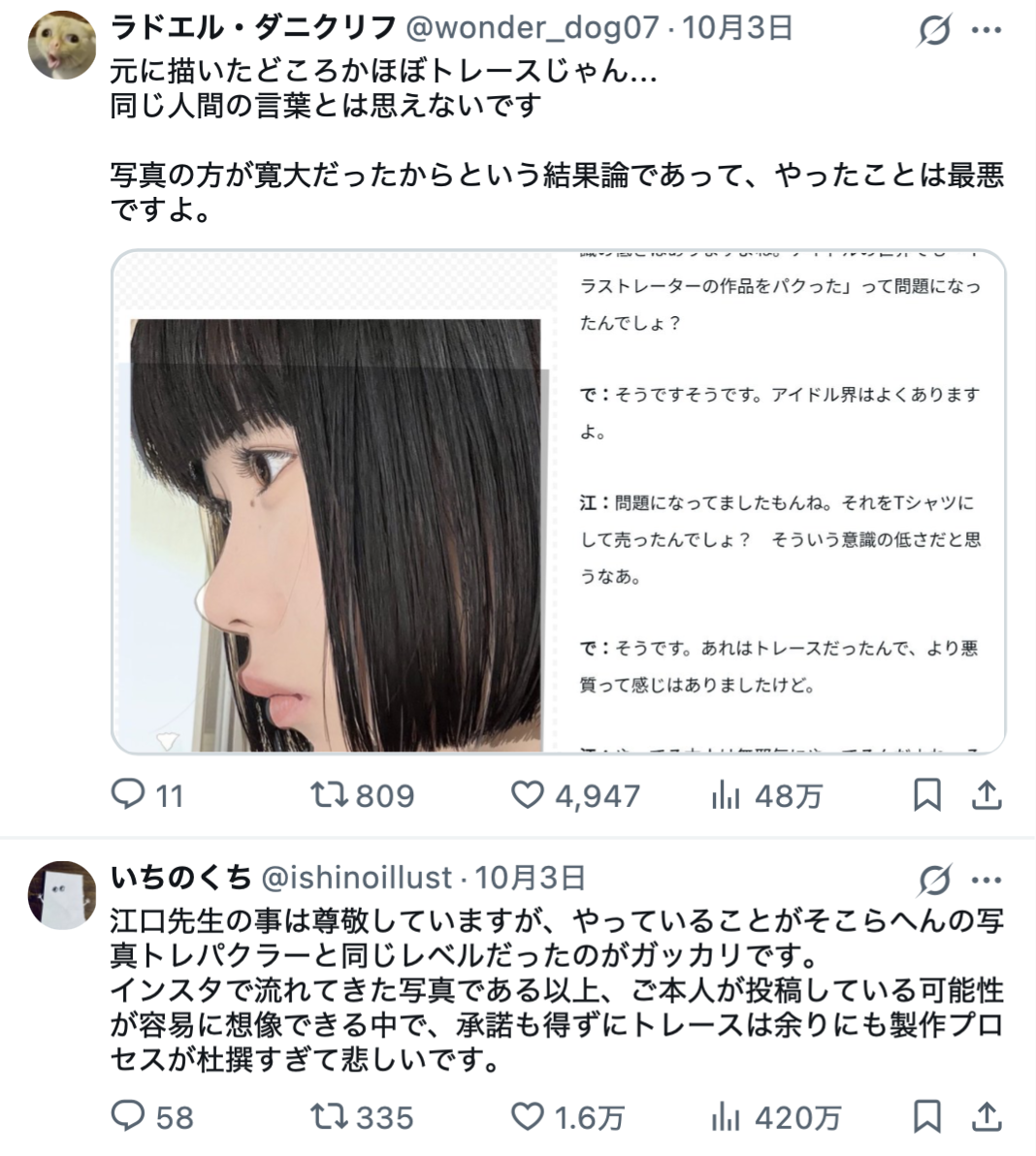 イラストレーターの江口寿史が、SNSに投稿された画像を無断でトレースしていたことが明らかになり、批判が殺到しています。