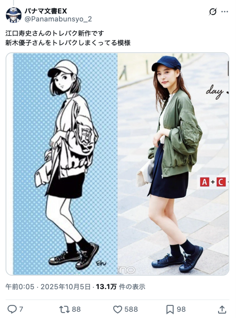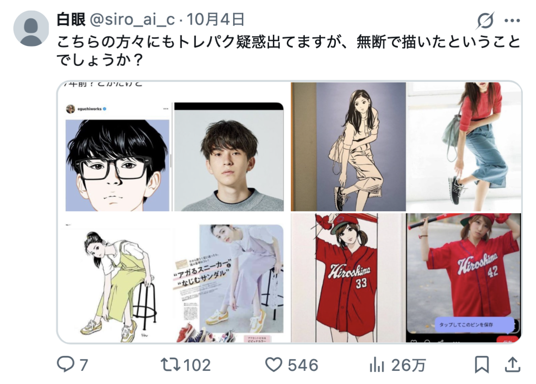 しかも、無断トレースの問題は今回だけにとどまらず、江口寿史の過去の作品の多くが、雑誌や広告、SNSに掲載された実在の女性や男性の写真をトレースしたものだったことが判明し、さらなる炎上騒動へと発展しています。