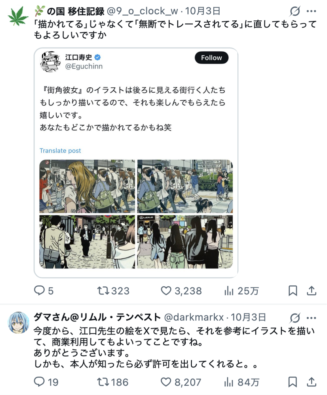 絵描きではなくトレース屋さんですか? pic.twitter.com/jBrXlBrAtg— 🌿の国 移住記録 (@9_o_clock_w) October 3, 2025