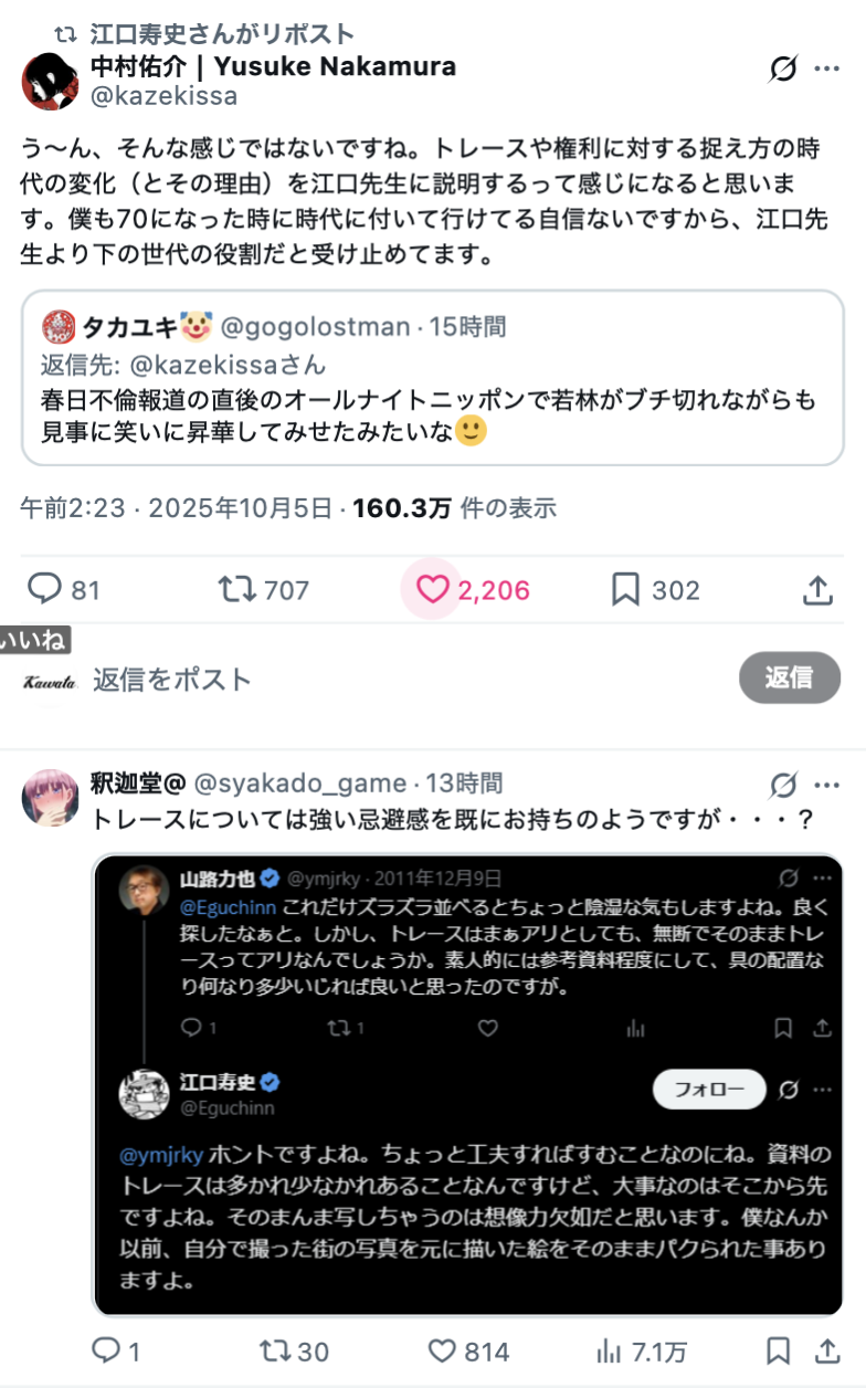 江口寿史先生、トレースや模写に対しての権利意識がしっかりあって好き。 pic.twitter.com/KQ4ZlBdQtA