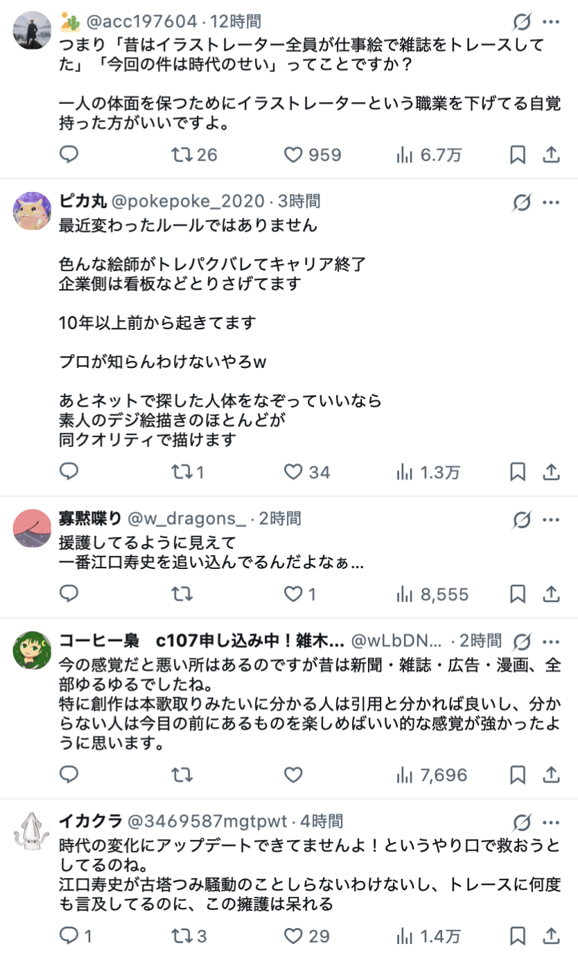 こうした状況の中、人気イラストレーターの中村佑介が一連の無断トレース問題に言及し、時代の変化を理由に江口寿史を遠回しに擁護するような投稿を行ったことで、批判の矛先が彼にも向けられる事態となっています。
