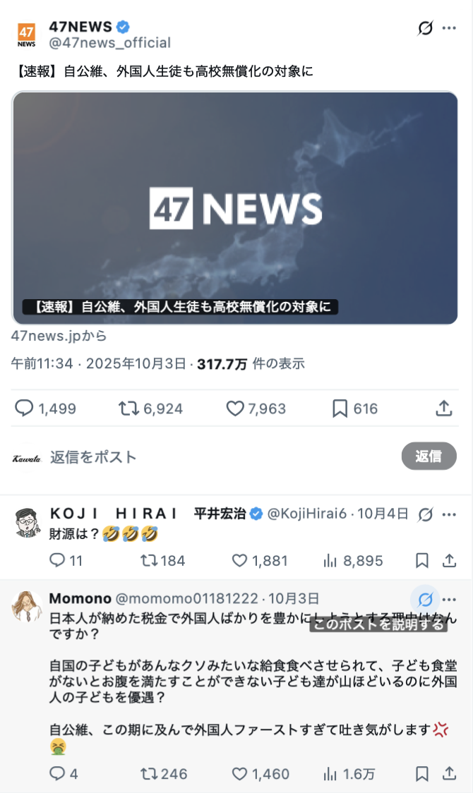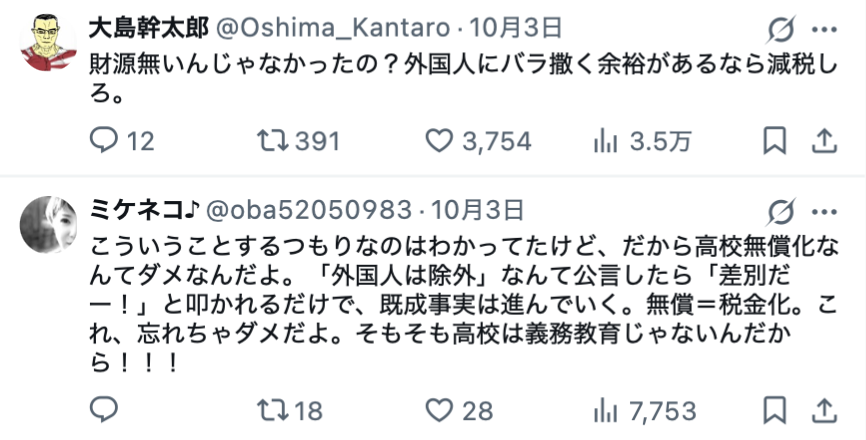【移民政策】自民・公明・維新、外国人生徒も高校の授業料無償化の対象に 留学生は対象外 ネット上では反対の声が殺到
