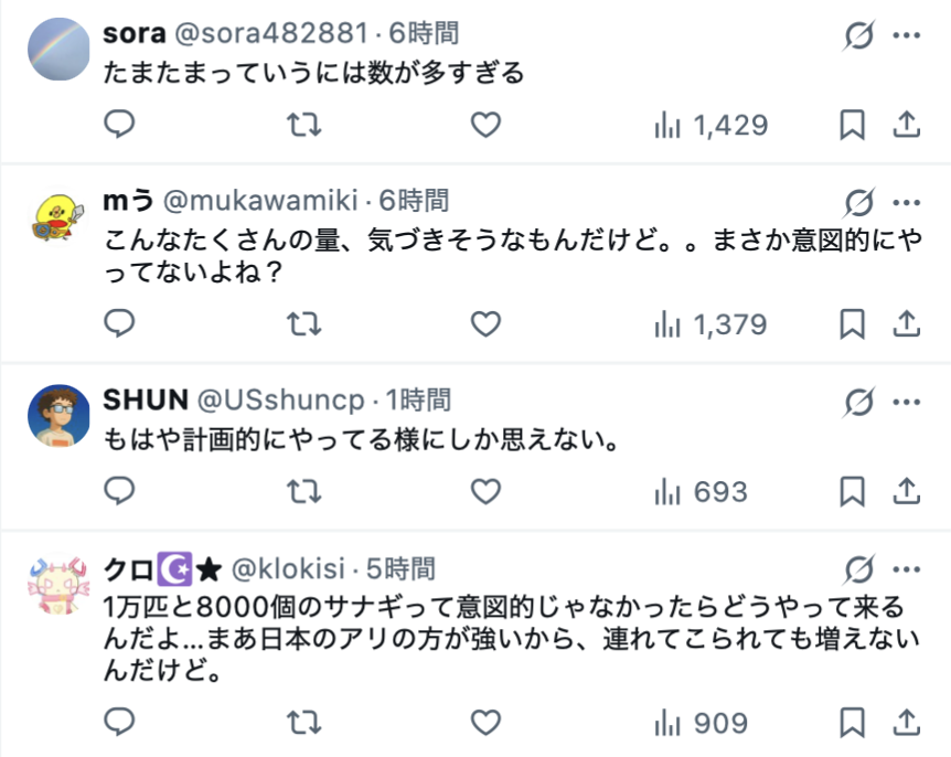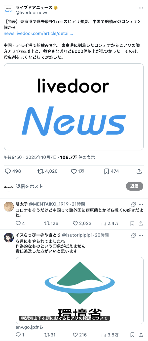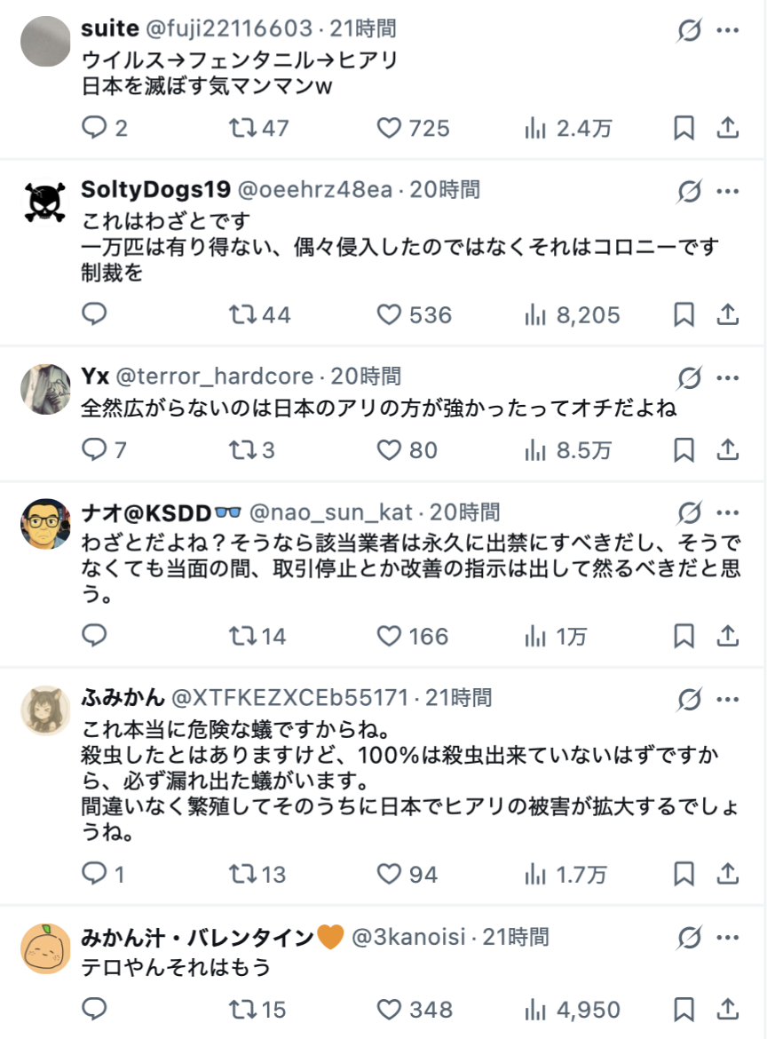 本来、ヒアリは土のある草地や地面の割れ目などに巣を作る習性を持っており、コンテナのような人工物の内部で大量に見付かるのは不自然だとして、意図的にヒアリを混入させているのではないかと疑う声がネット上では広がっています。