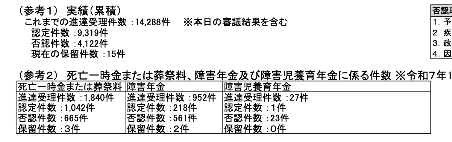 36件の請求内容は、「医療費・医療手当」が24件(認定5件、保留2件)、「死亡一時金・葬祭料」が7件(認定4件)、「障害年金」が5件(認定なし)だったとのことです。