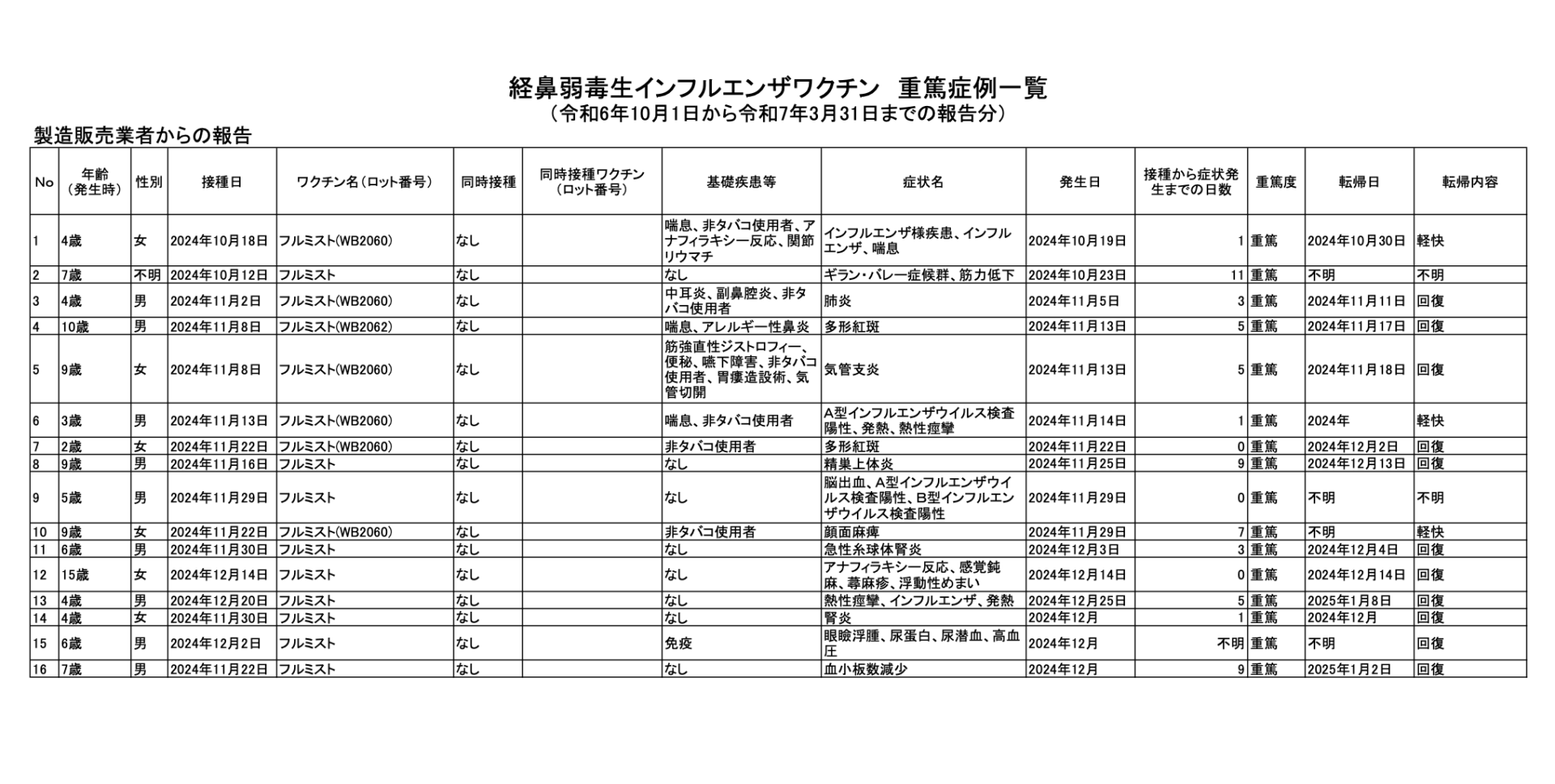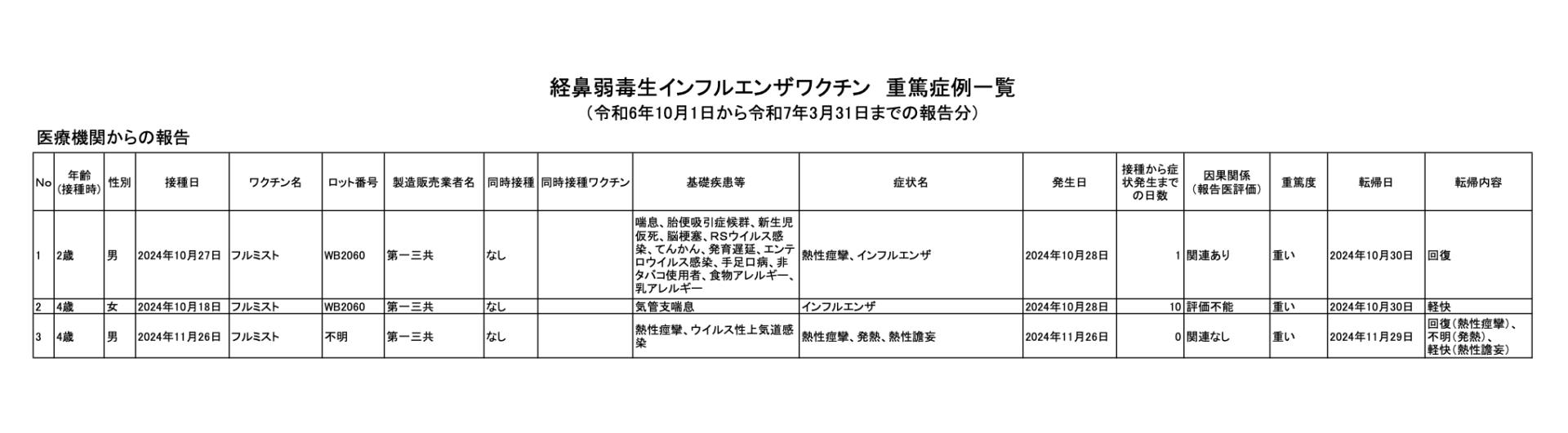 このうち5歳の男の子は、基礎疾患のない健康な状態だったとのことですが、昨年11月29日にフルミストを投与され、その日のうちに脳出血を発症しており、その後の回復状況などの詳細は明らかになっていません。