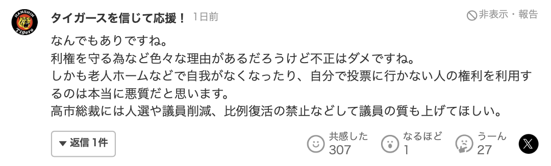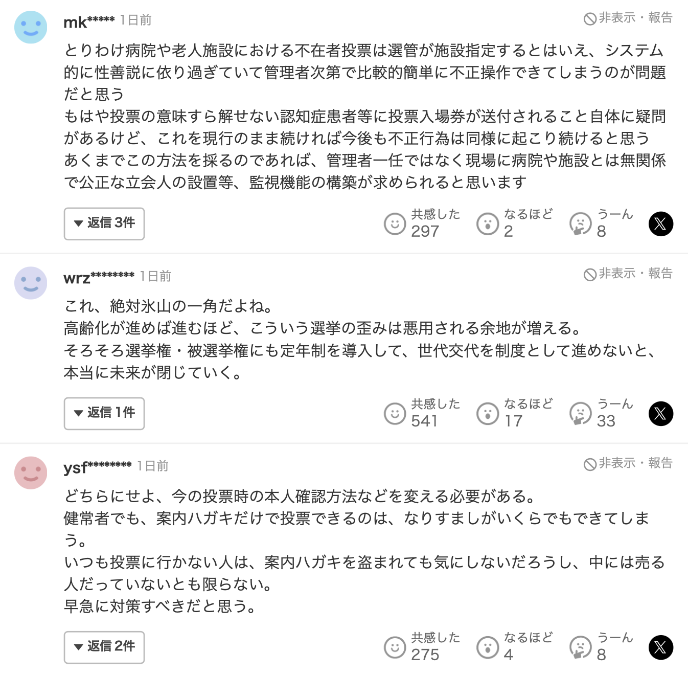 今回の事件を受け、ネット上では「これ、絶対氷山の一角だよね。 高齢化が進めば進むほど、こういう選挙の歪みは悪用される余地が増える」「システム的に性善説に依り過ぎていて管理者次第で比較的簡単に不正操作できてしまうのが問題だと思う」「以前介護施設で働いていましたがこの手のやり口と似たようなことよくありましたよ。 ・創価学会員が入居者の部屋まで来て公明党に入れて欲しいという挨拶まわり。ひどければ車で迎えに来て何人も連れて期日前を含む投票」「似たような光景は何回か目にした事がありますよ。施設の送迎車で期日前投票に大勢連れて来て堂々と〇〇候補を書いてとスタッフが話してましたが、選挙管理者もさして注意していなかった」といった様々な声がネット上に多数寄せられています。