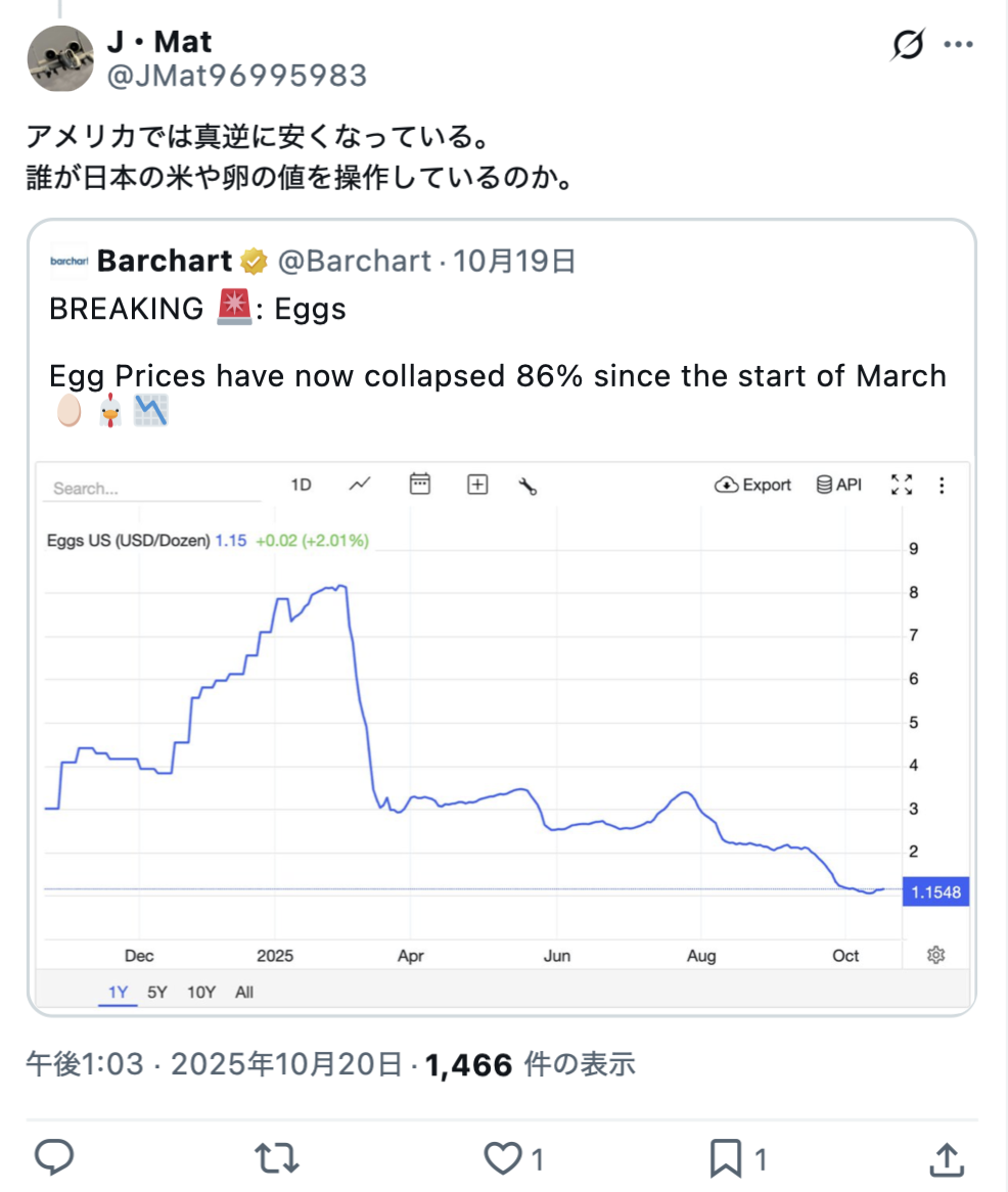 しかし最近は、供給の増加や季節的な需要の減少を背景に、卵1パックあたりの卸売価格が1.15ドル(約174円)と急速に下落しているとのことです。