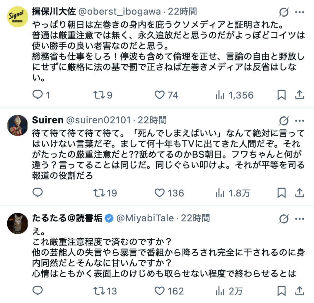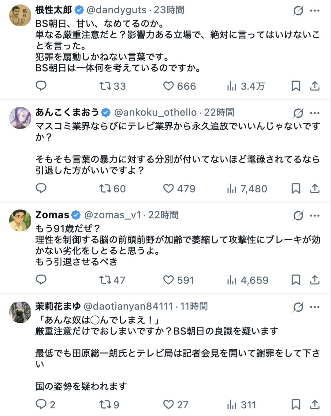 しかし、発言があまりにも過激で、犯罪を誘発しかねない内容だったことから、「BS朝日、甘い、なめてるのか。 単なる厳重注意だと?影響力ある立場で、絶対に言ってはいけないことを言った。 犯罪を扇動しかねない言葉です」「マスコミ業界ならびにテレビ業界から永久追放でいいんじゃないですか?」「もう91歳だぜ? 理性を制御する脳の前頭前野が加齢で萎縮して攻撃性にブレーキが効かない劣化をしとると思うよ。 もう引退させるべき」「え。 これ厳重注意程度で済むのですか? 他の芸能人の失言やら暴言で番組から降ろされ完全に干されるのに身内同然だとそんなに甘いんですか?」といった批判の声がネット上で殺到し、炎上しています。