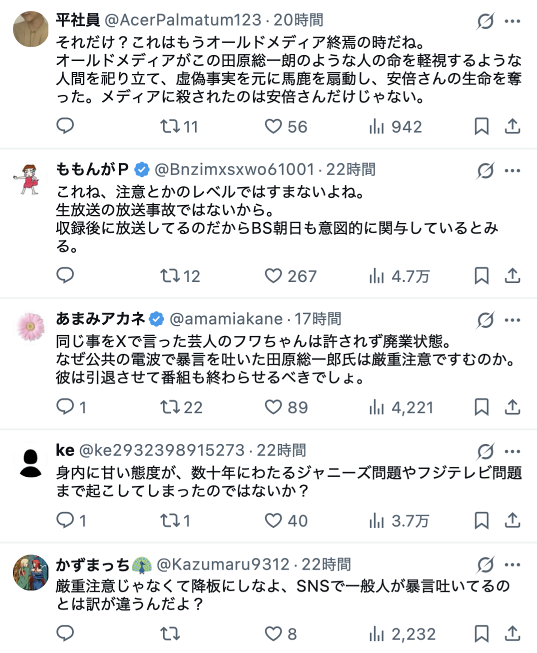 これを受け、BS朝日は「10月19日放送の討論番組『激論!クロスファイア』での司会・田原総一朗氏の発言に一部不適切な内容がございましたため、厳重注意といたしました。いただいたご意見は真摯に受け止め、今後の番組作りに生かしてまいります」とコメントしました。