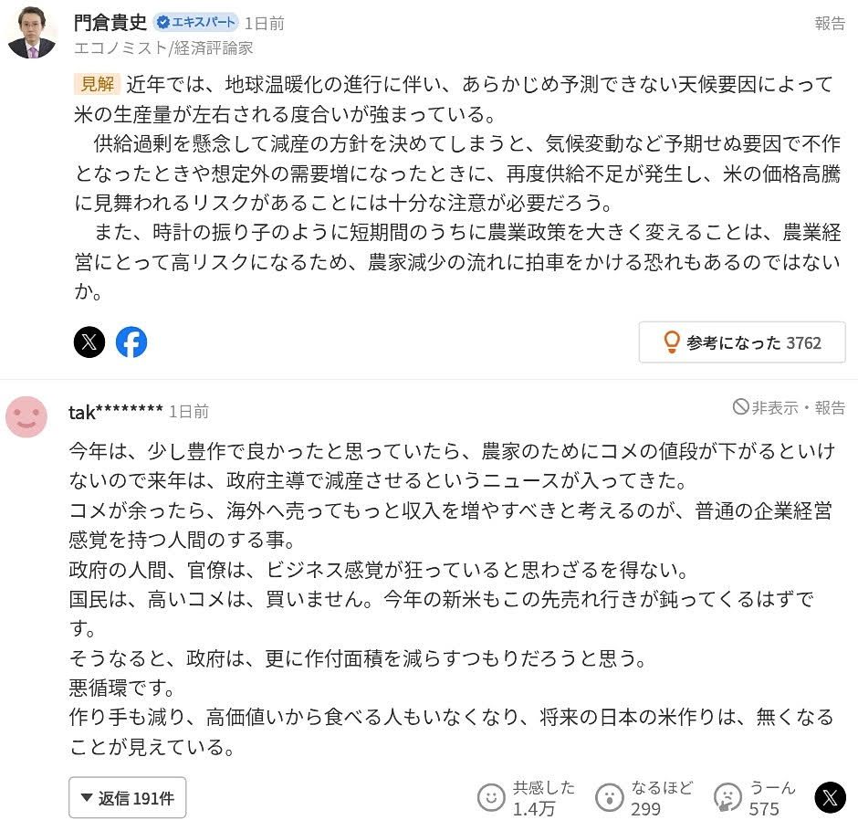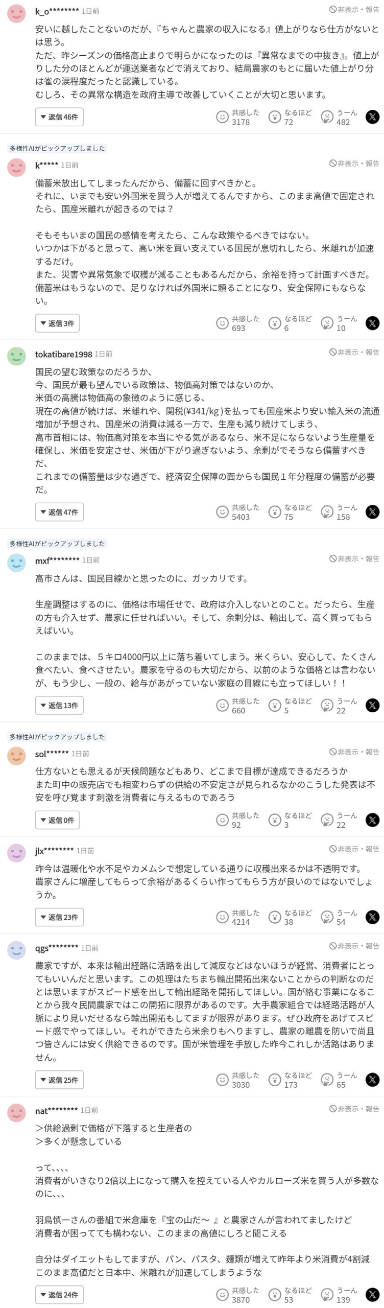 これを受けて、ネット上では「そもそもいまの国民の感情を考えたら、こんな政策やるべきではない。いつかは下がると思って、高い米を買い支えている国民が息切れしたら、米離れが加速するだけ」「仕方ないとも思えるが天候問題などもあり、どこまで目標が達成できるだろうか」「農家ですが、本来は輸出経路に活路を出して減反などはないほうが経営、消費者にとってもいいんだと思います」などと指摘する声が多数投稿されています。