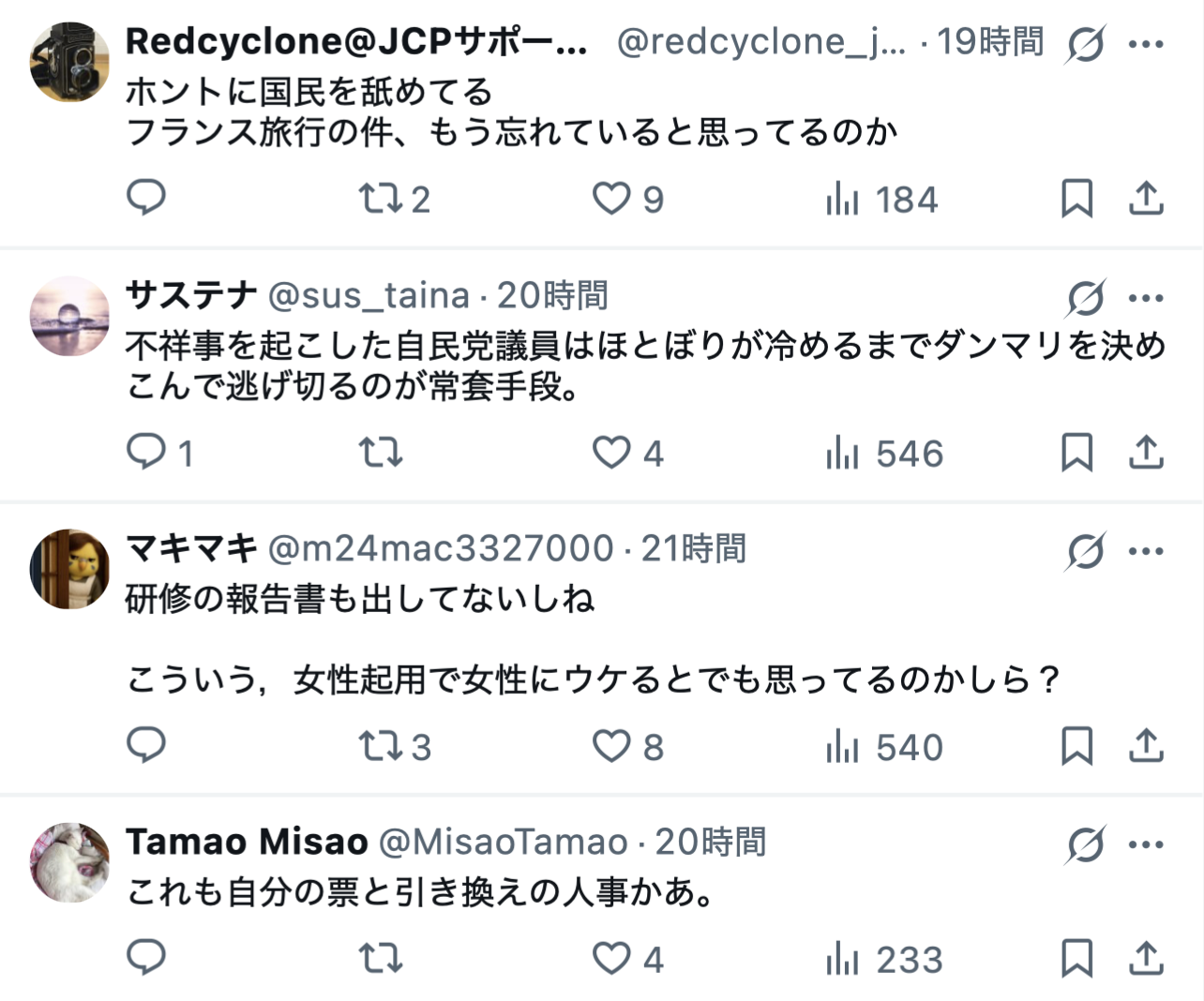 今回の人事について、有村治子総務会長は24日の記者会見で、国会の政治倫理審査会で弁明を済ませたことなどを踏まえて「(両氏ともに)一定の説明責任を果たしている」と語りましたが、ネット上では「ホントに国民を舐めてる。フランス旅行の件、もう忘れていると思ってるのか」「不祥事を起こした自民党議員はほとぼりが冷めるまでダンマリを決めこんで逃げ切るのが常套手段」「ほんま国民感情逆なで内閣ですね」「高市を擁護しているネット民多いけれど、裏金議員を多数登用しているのは絶対に許せない」といった批判の声が殺到しています。
