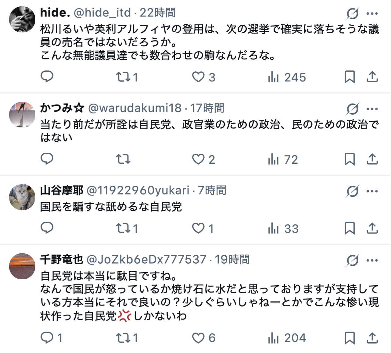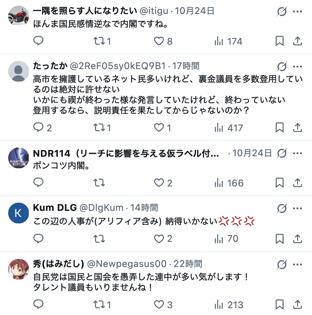 ◯【高市総理】副大臣・政務官に裏金議員を計7人起用し、批判殺到 SNS上では政権批判を押さえつける動きも