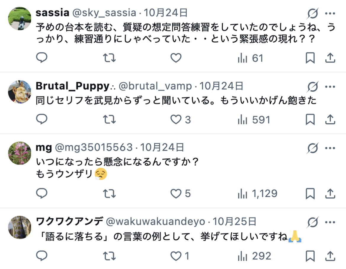 そのため、ネット上では「こんなに分かりやすい『語るに落ちた』会見はないですね」「凄いな。高市氏になってもこの姿勢は変わらんのかな」「質問されてもいないのに、重大な懸念は認められていない。と先手を打つのは、事の重大さを知ってあるからですね。早く、調査をして然るべき判断をして欲しいです」「まるで武見・福岡の完コピ。一言一句変わらん」といった批判の声が殺到しています。
