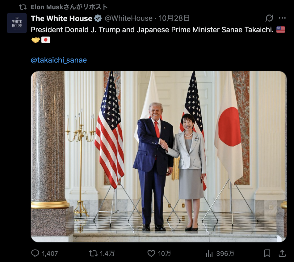 イーロン・マスクはこのほかにも、高市総理とトランプ大統領が握手を交わしている写真の投稿をリポストしたり、高市総理の若い頃の写真に炎の絵文字で反応するなど、好意的な姿勢を見せています。