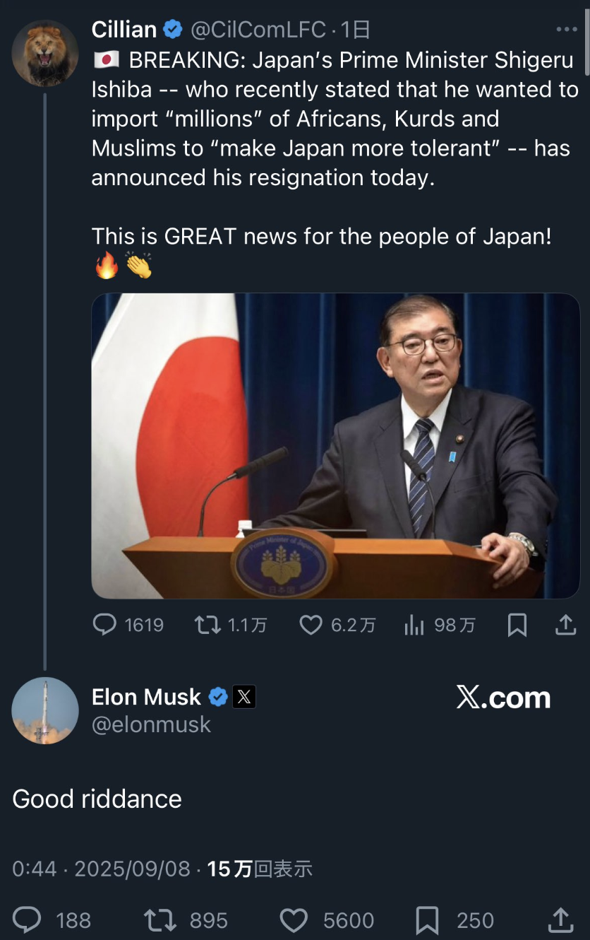 イーロン・マスクは、外国人労働者の受け入れ策を批判しており、石破政権がアフリカ人やクルド人の受け入れに寛容な姿勢を見せていると指摘する投稿に対し、「もし石破がこれを推し進めるなら、彼は日本を破壊した者として日本の歴史上、最も大きな犯罪者とみなされるだろうし、そうあるべきだ。日本とは土地ではなく、人々である」と述べていました。