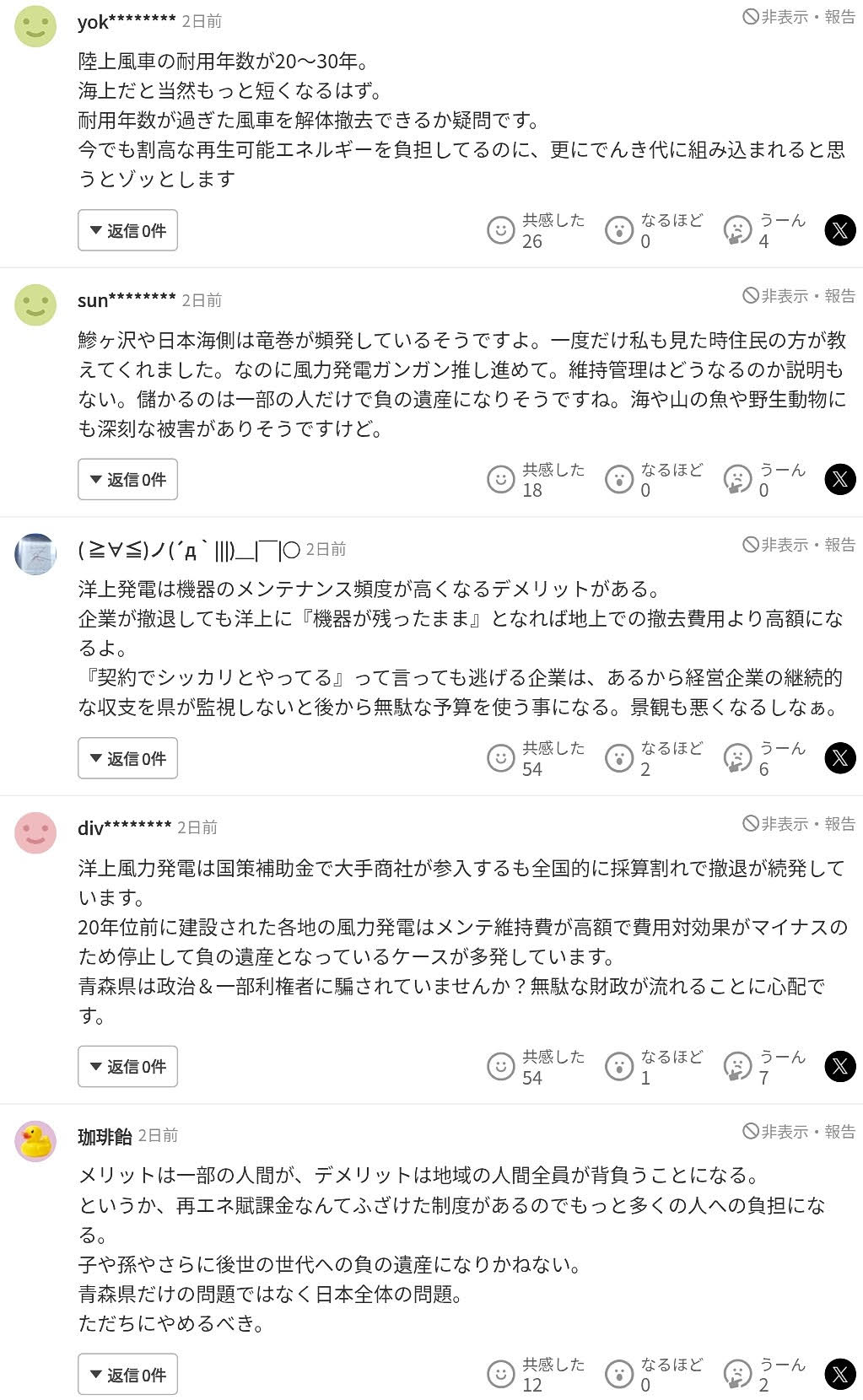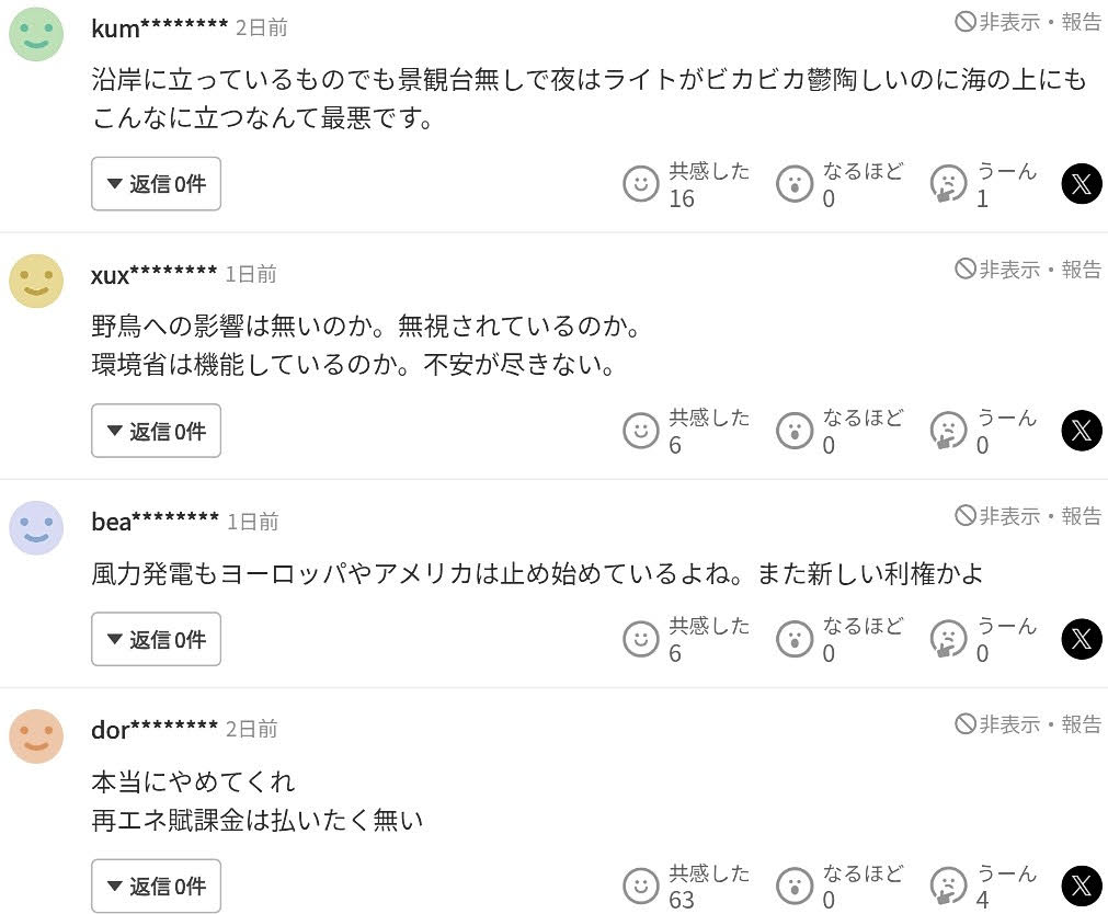 こうした動きを受け、ネット上では「今でも割高な再生可能エネルギーを負担してるのに、さらに電気代に組み込まれると思うとゾッとします」「20年位前に建設された各地の風力発電はメンテ維持費が高額で費用対効果がマイナスのため停止して負の遺産となっているケースが多発しています」「メリットは一部の人間が、デメリットは地域の人間全員が背負うことになる」「沿岸に立っているものでも景観台無しで夜はライトがビカビカ鬱陶しいのに海の上にもこんなに立つなんて最悪です」「野鳥への影響は無いのか。無視されているのか。 環境省は機能しているのか。不安が尽きない」といった批判が殺到しています。