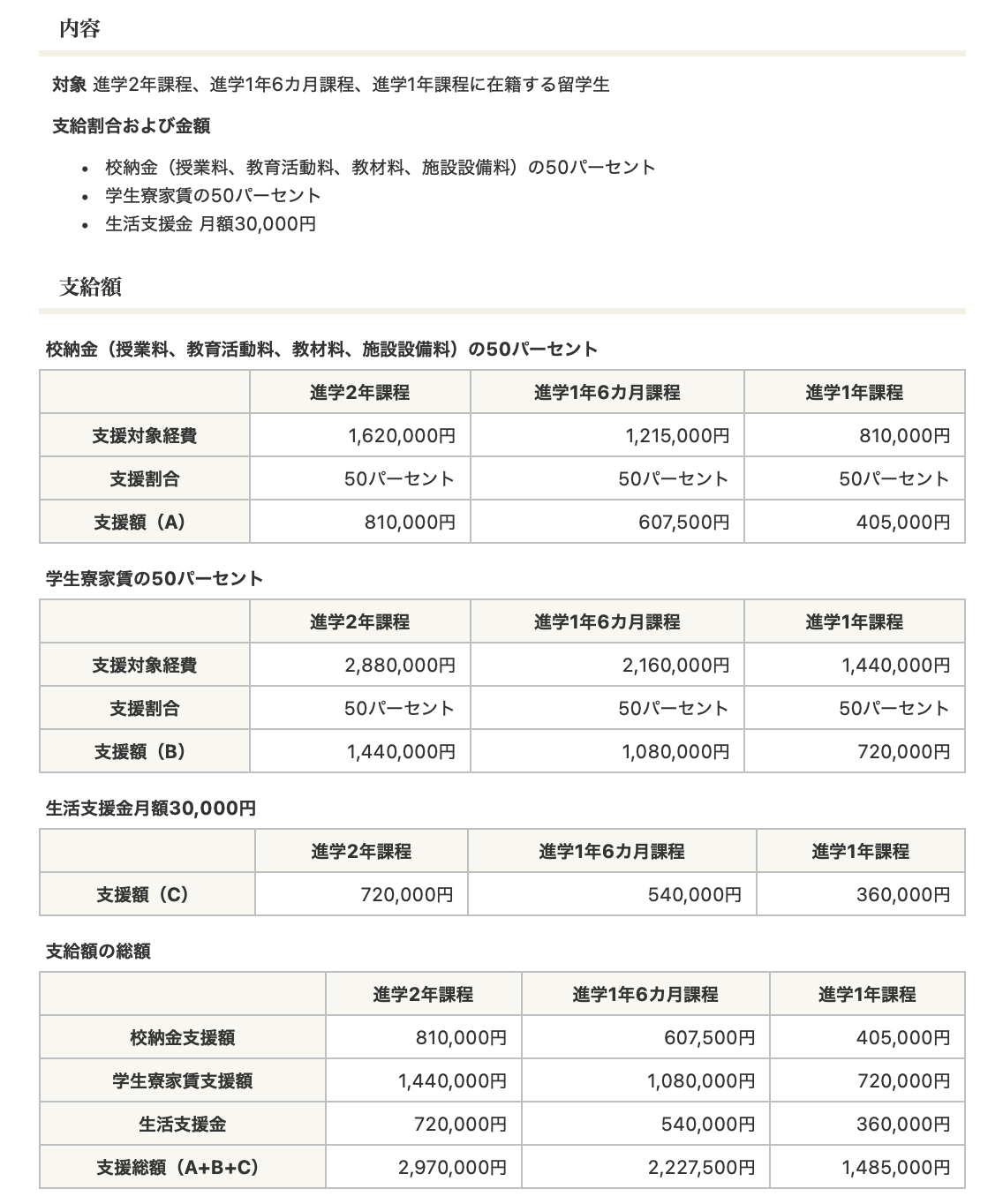 大崎市によると、日本語学校の進学2年課程、進学1年6カ月課程、進学1年課程に在籍する留学生に対し、それぞれ授業料や教材費などを含む校納金の50%、学生寮家賃の50%、さらに月額3万円の生活支援金を支給しており、その支援額は進学1年課程で約150万円、進学2年課程で297万円に上るとのことです。
