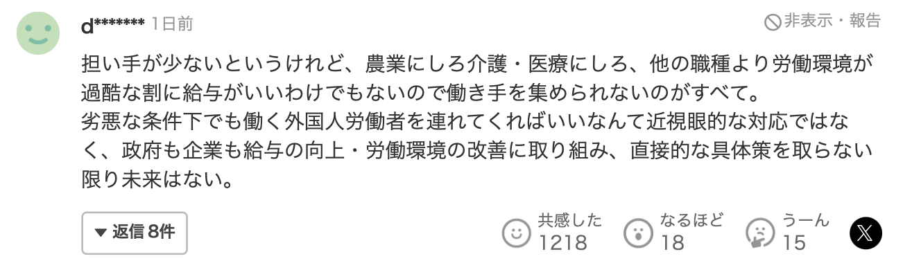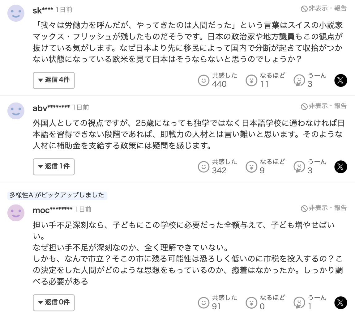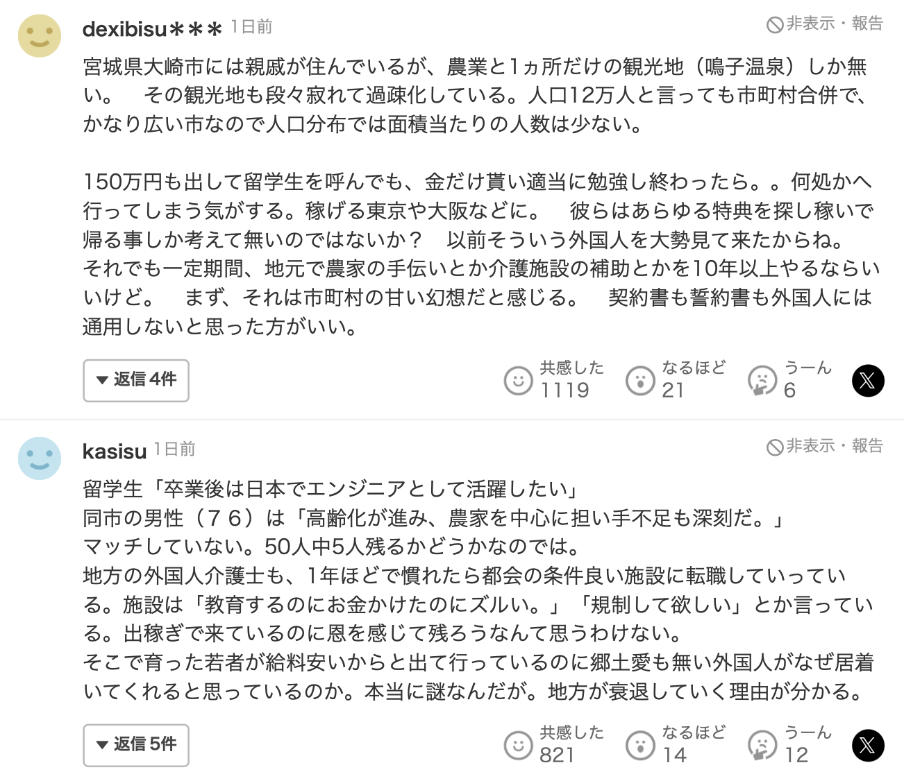 そのため、「『我々は労働力を呼んだが、やってきたのは人間だった』という言葉はスイスの小説家マックス・フリッシュが残したものだそうです。日本の政治家や地方議員もこの観点が抜けている気がします」「担い手が少ないというけれど、農業にしろ介護・医療にしろ、他の職種より労働環境が過酷な割に給与がいいわけでもないので働き手を集められないのがすべて」「(留学生の目的と地元で必要とされる人材が)マッチしていない。50人中5人残るかどうかなのでは」といった厳しい批判の声がネット上では多数寄せられています。