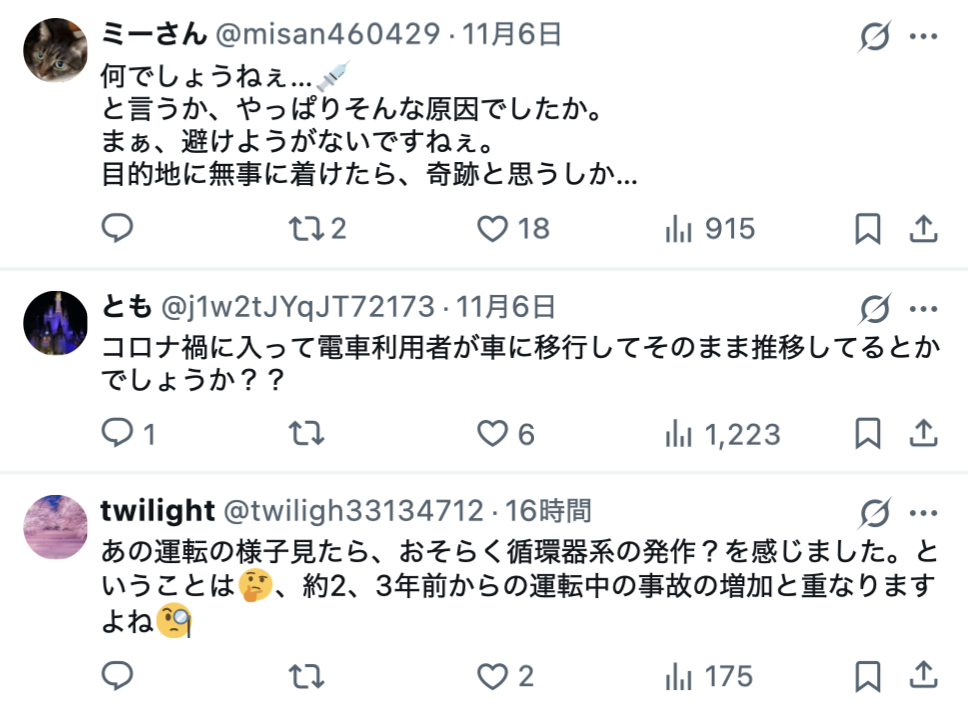 この数年、運転中に体調不良に陥り事故を起こすケースが相次いで報じられており、その度にコロナワクチン接種の影響を疑う声や接種履歴の公開を求める声がネット上で数多く寄せられています。