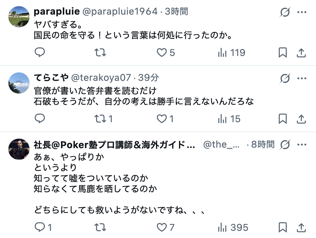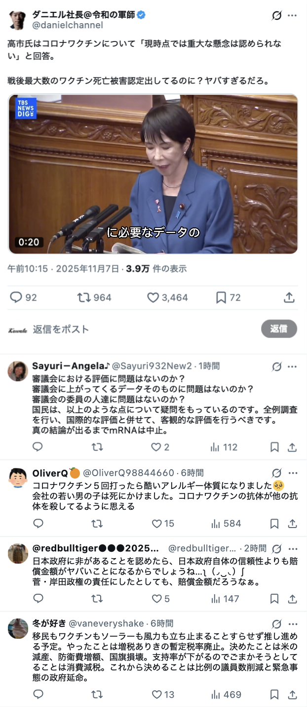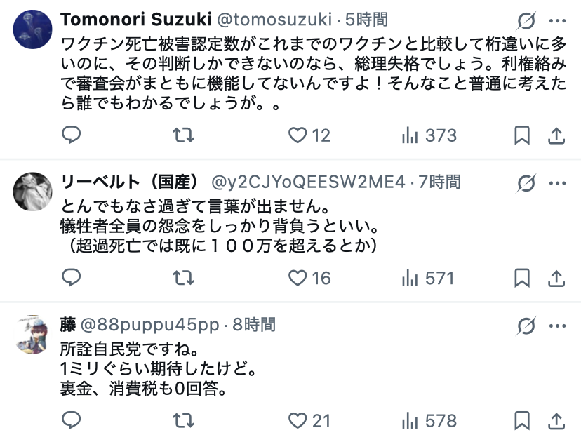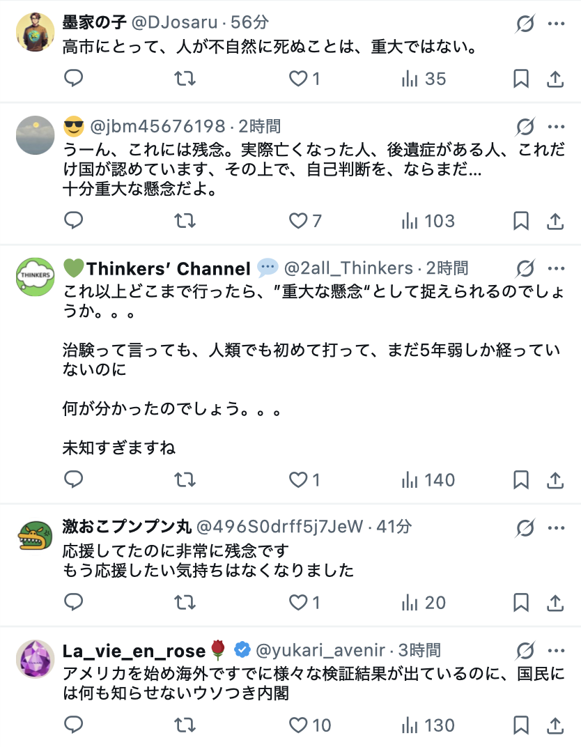 今回の高市総理の発言を受け、「ヤバすぎる。 国民の命を守る!という言葉は何処に行ったのか」「高市にとって、人が不自然に死ぬことは、重大ではない」「所詮自民党ですね。 1ミリぐらい期待したけど。 裏金、消費税も0回答」「アメリカをはじめ海外ですでに様々な検証結果が出ているのに、国民には何も知らせないウソつき内閣」「応援してたのに非常に残念です もう応援したい気持ちはなくなりました」といった失望の声が殺到しています。