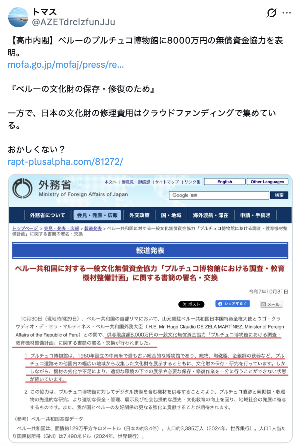 こうした中、日本政府はペルーのプルチュコ博物館に対し、8000万円の無償資金協力を行うことを表明しました。