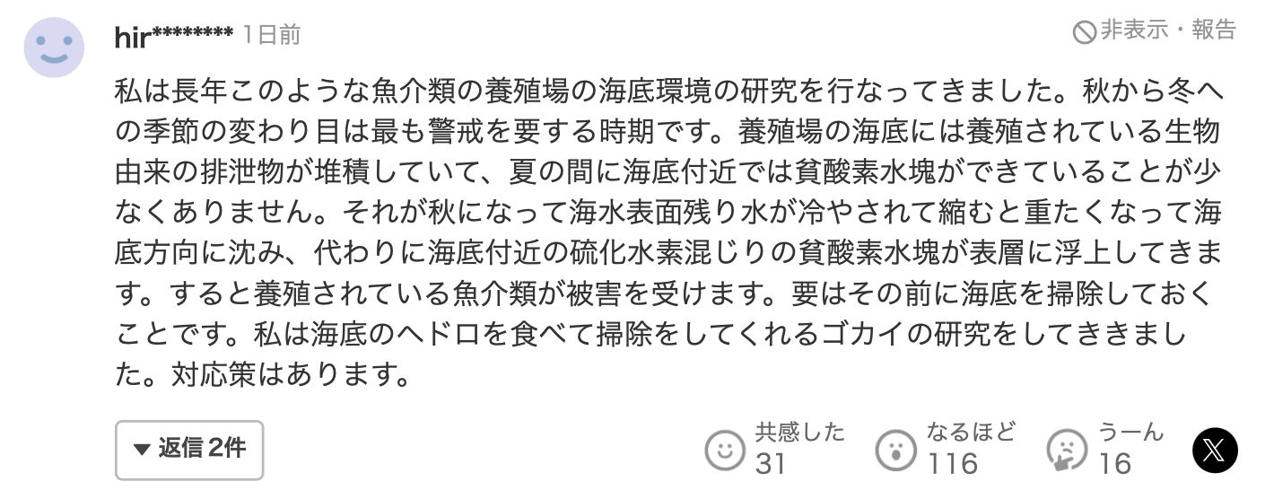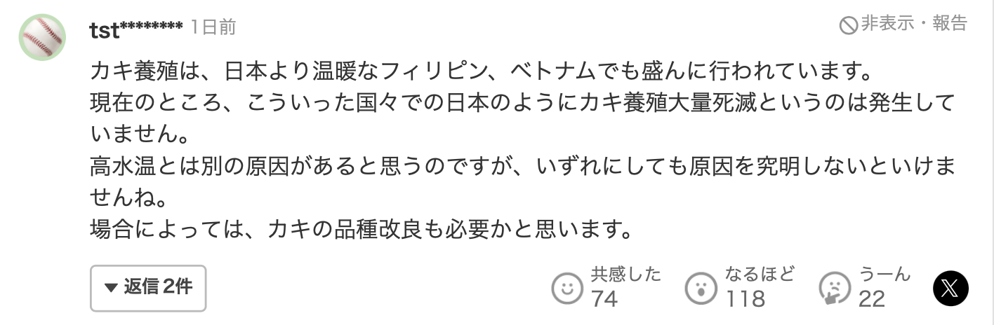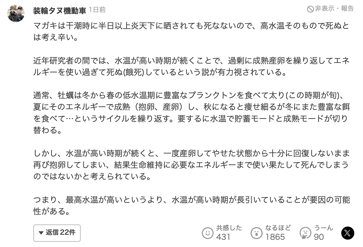こうした状況を受け、ネット上では「異例の猛暑によってカキの成長サイクルが乱れ、餓死したのではないか」「養殖いかだの下に排泄物が溜まり、環境が悪化したことが死滅の一因ではないか」など、様々な憶測が飛び交っています。