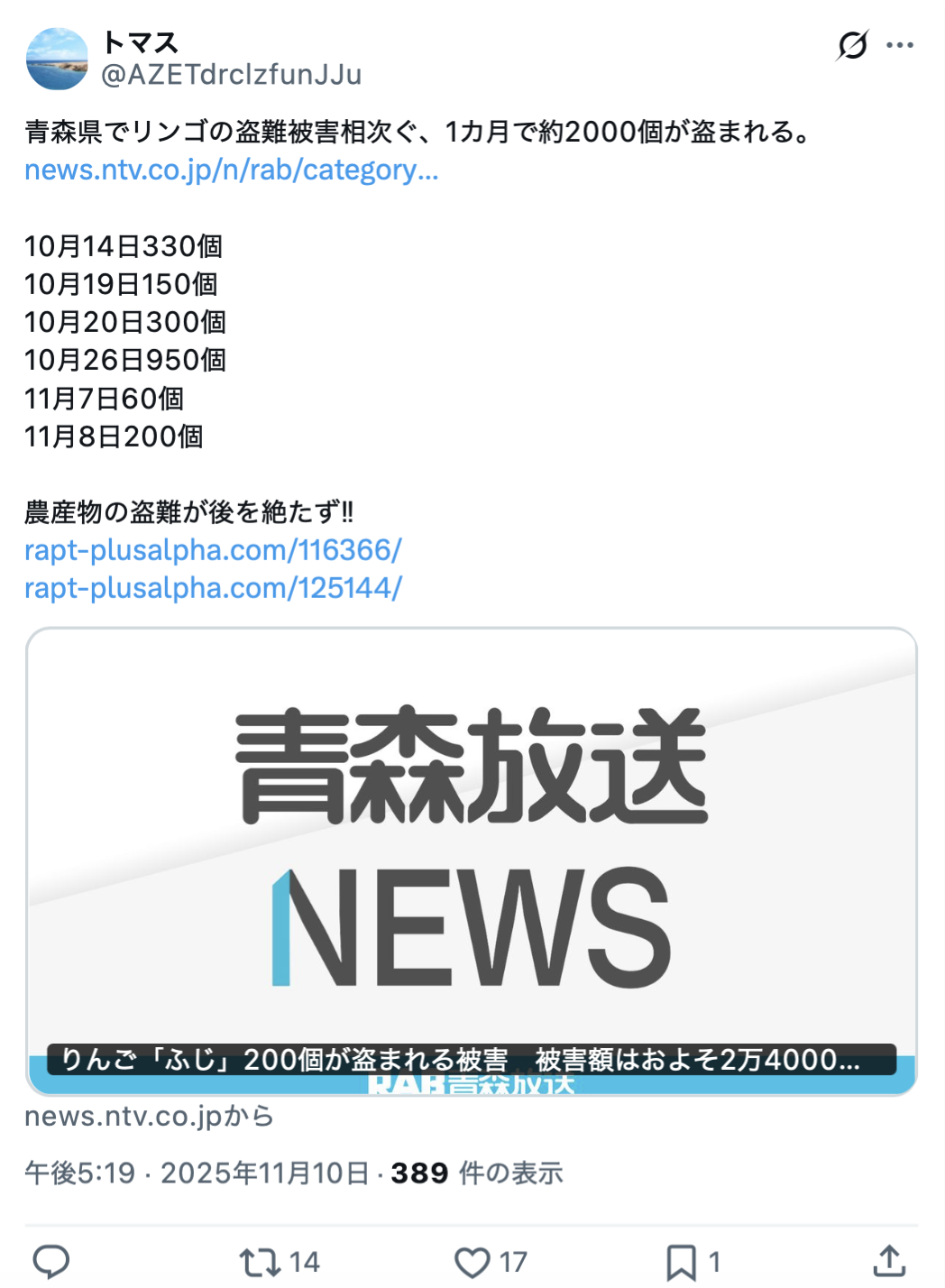 ◯青森県で収穫したリンゴ約1200個が盗難、福岡県で収穫前のキウイ約750キロが盗難 日本各地で農作物の盗難事件が相次ぐ