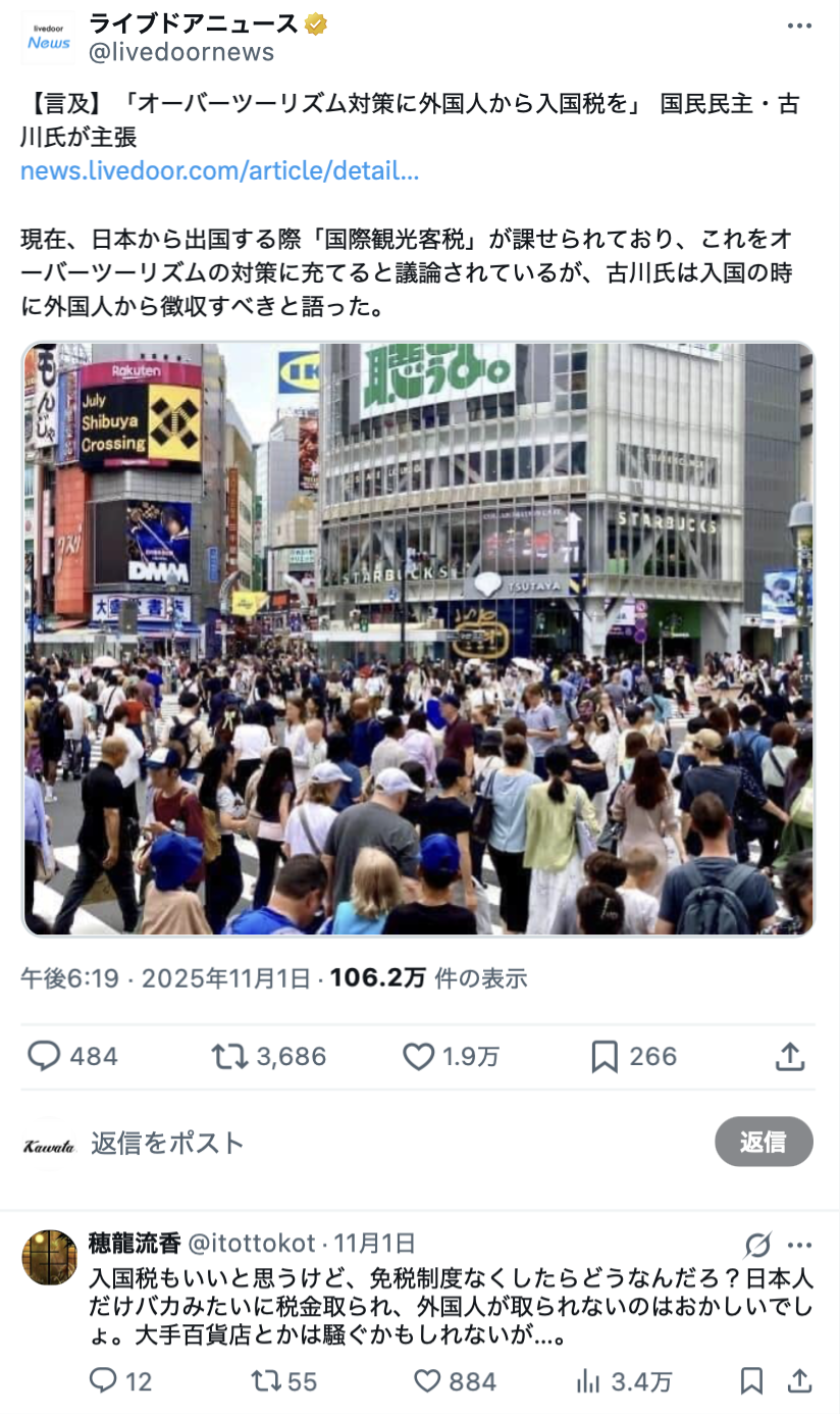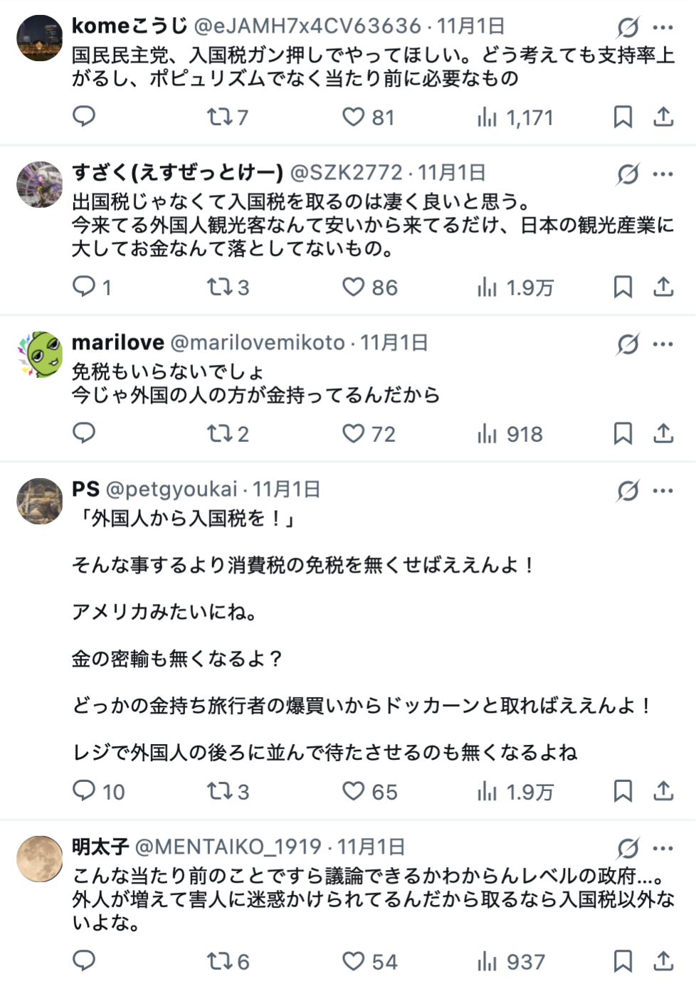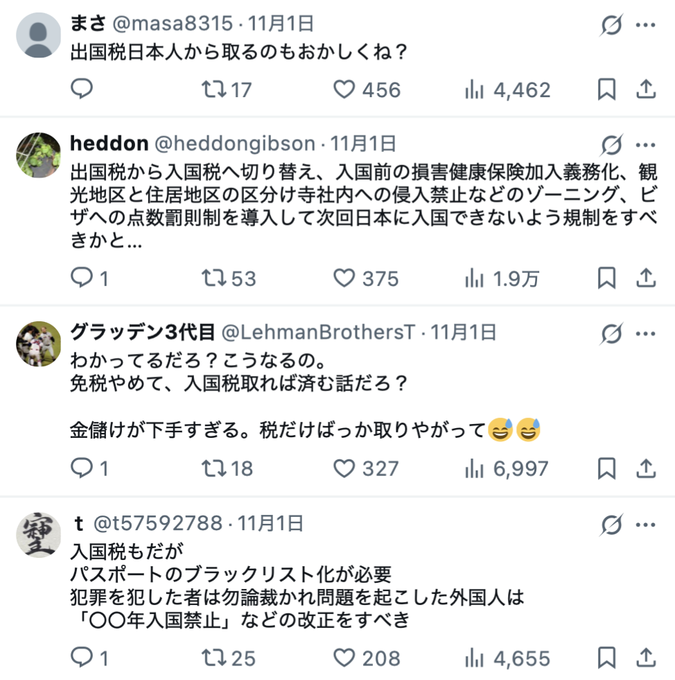 一方、ネット上ではこうした政府の動きに対し、「出国税を日本人から取るのもおかしくね?」「免税やめて、入国税取れば済む話だろ?」「入国税もいいと思うけど、免税制度なくしたらどうなんだろ?日本人だけバカみたいに税金取られ、外国人が取られないのはおかしいでしょ」「マナー違反や環境破壊、犯罪を防ぐためにも入国へのハードルは必要。 出国税ではそのまま日本にいることを助長する。 犯罪歴などの情報管理も含めてルール化、罰則化した方がいい」といった批判や疑問の声が殺到しています。