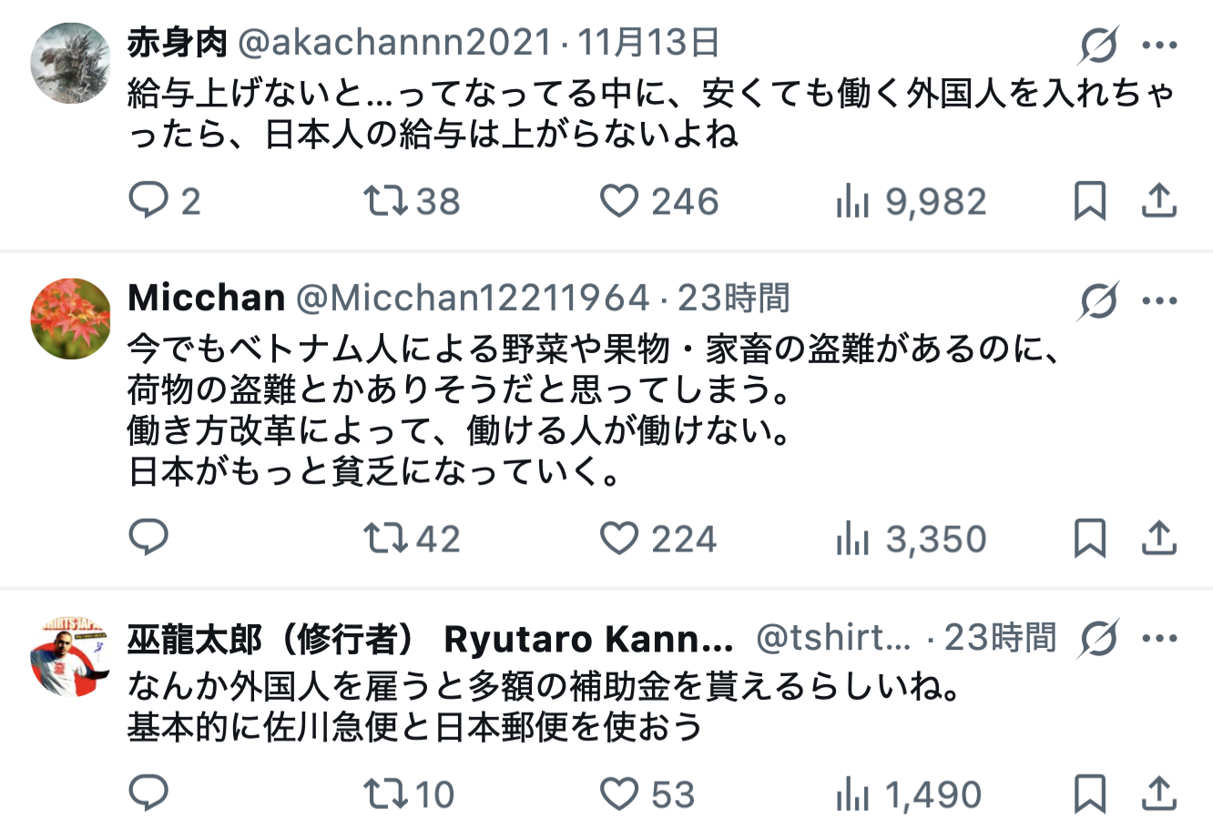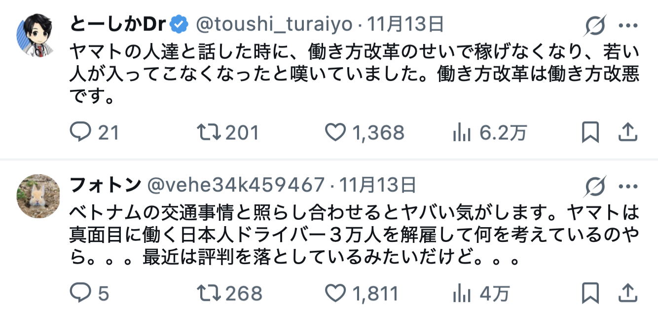 しかも、ヤマト運輸は2023年に3万人もの配達員(個人事業主)を解雇していることから、同社の取り組みに対し、「ヤマト運輸、 日本人を大量解雇しておいて ベトナム人を雇用 人手不足は嘘」「ヤマトの人達と話した時に、働き方改革のせいで稼げなくなり、若い人が入ってこなくなったと嘆いていました。働き方改革は働き方改悪です」「給与上げないと…ってなってる中に、安くても働く外国人を入れちゃったら、日本人の給与は上がらないよね」といった批判の声が殺到しています。
