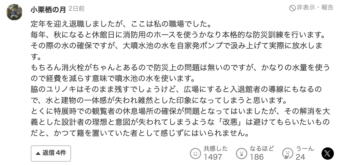また、前庭の池は水を溜めておくことで緊急時の消火活動にも利用でき、実際に東京国立博物館の消火訓練では池の水が使われていたことから、貴重な収蔵物を守るためにも、消火栓が使えない場合を想定して残すべきではないかと指摘する声も上がっています。