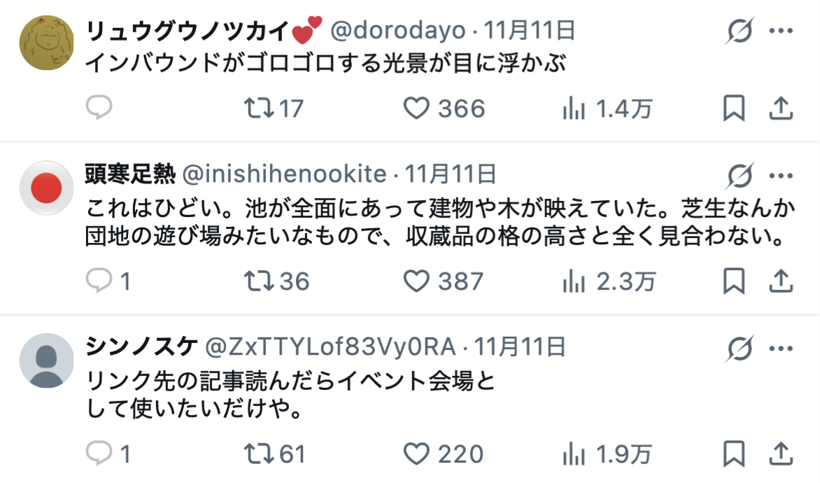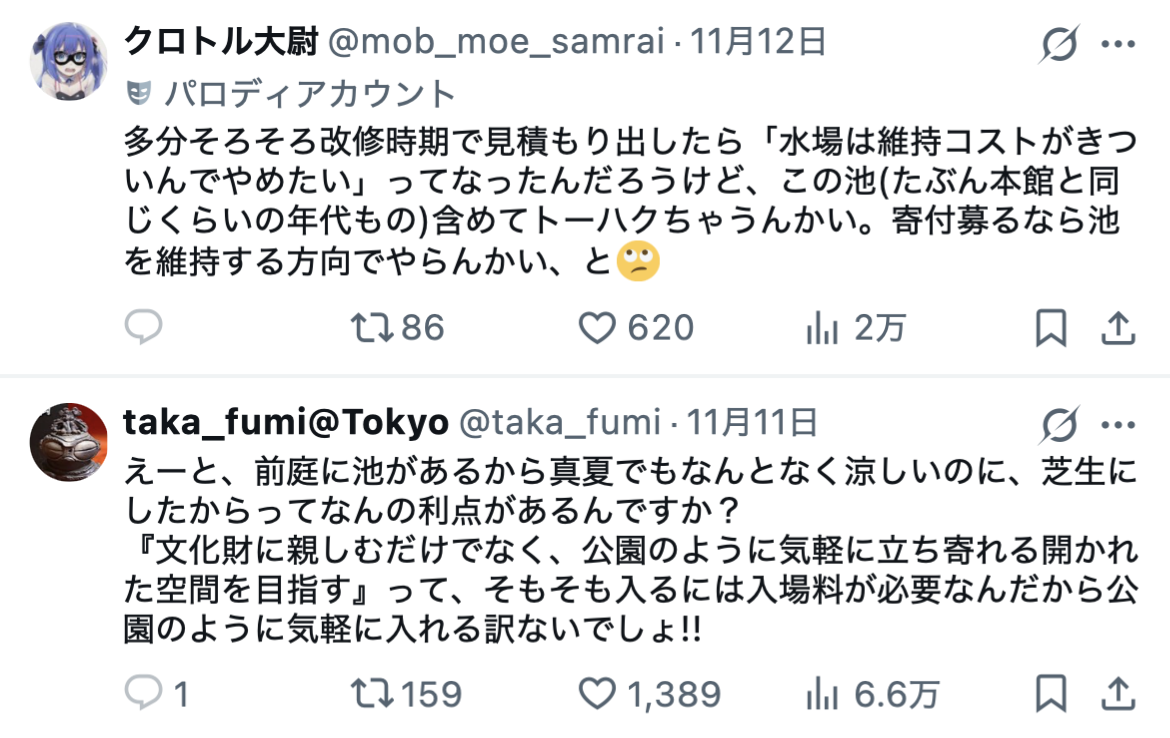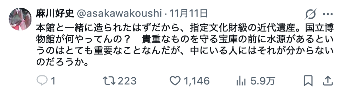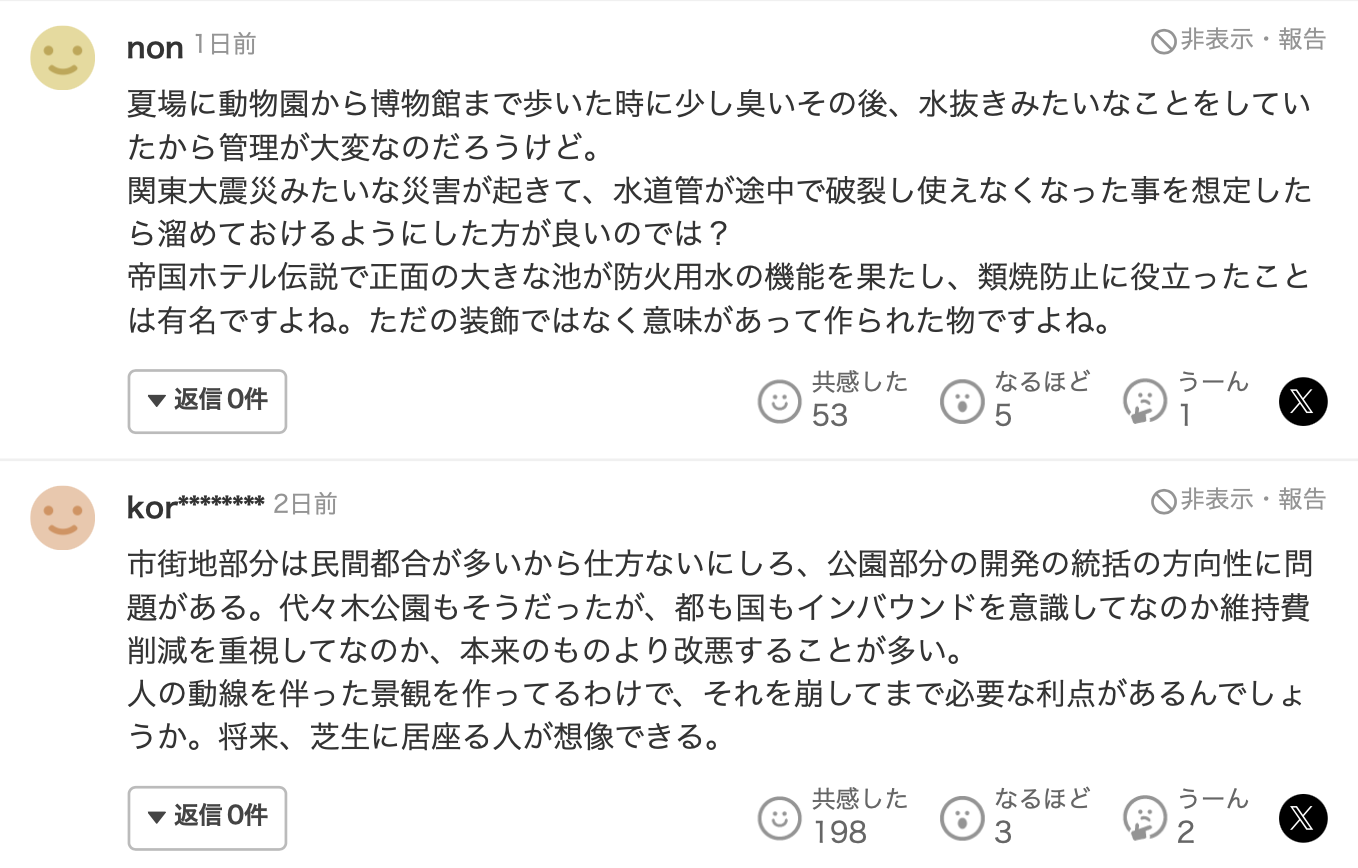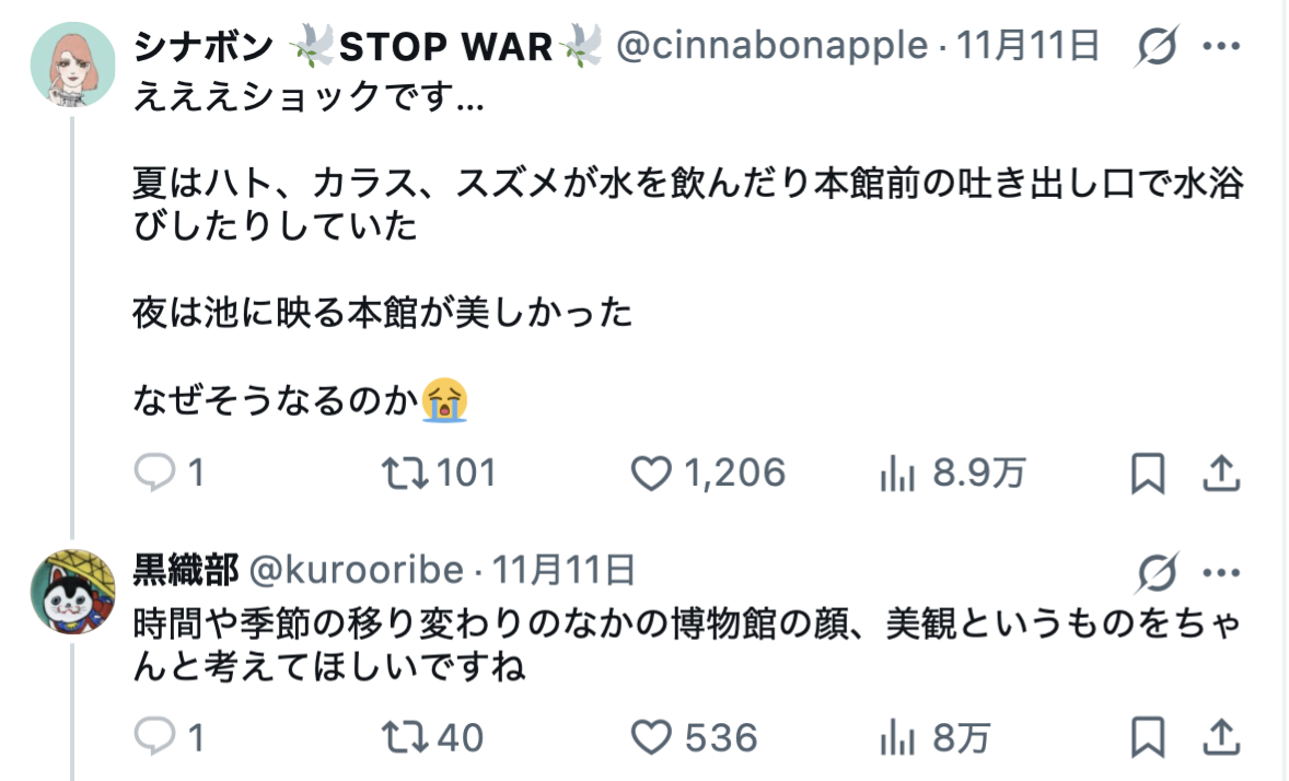 こうした方針に対し、「維持する費用も改修費用も無いってことか…」「池をなくす? 正気ですか?」「えええショックです… 夏はハト、カラス、スズメが水を飲んだり本館前の吐き出し口で水浴びしたりしていた 夜は池に映る本館が美しかった」「本館と一緒に造られたはずだから、指定文化財級の近代遺産。国立博物館が何やってんの?」「インバウンドがゴロゴロする光景が目に浮かぶ」といった批判の声が殺到しています。