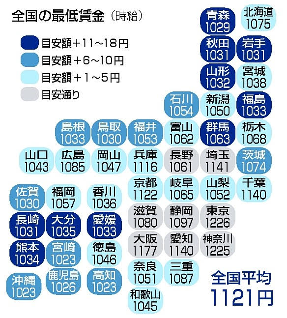 ◯画像:【図解】最低賃金、全国平均1121円=66円上げ、目安超え39道府県 より