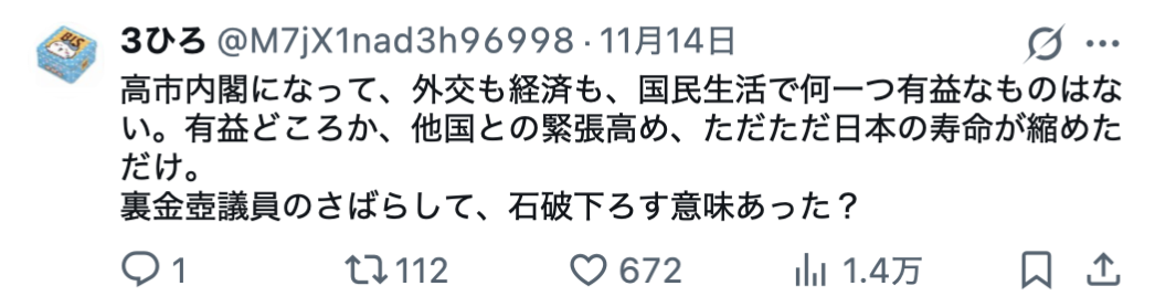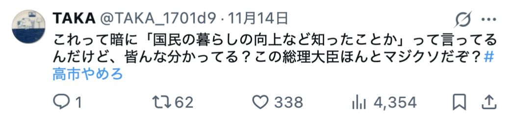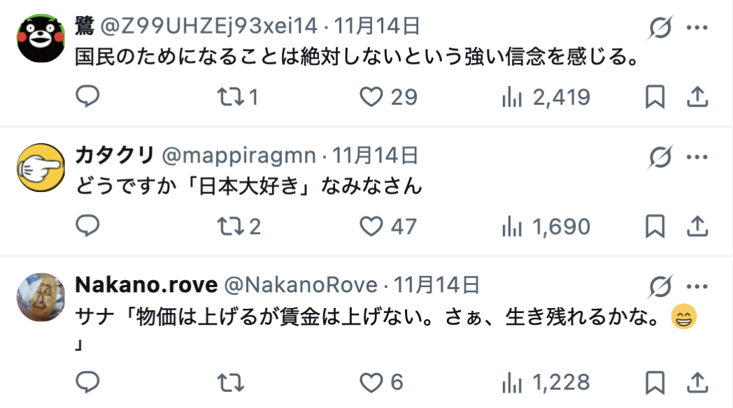 そのため、今回の発言に対し、「高市内閣になって、外交も経済も、国民生活で何一つ有益なものはない。有益どころか、他国との緊張高め、ただただ日本の寿命が縮めただけ」「これって暗に『国民の暮らしの向上など知ったことか』って言ってるんだけど、皆んな分かってる?」「国民のためになることは絶対しないという強い信念を感じる」といった批判の声がネット上では数多く上がっています。