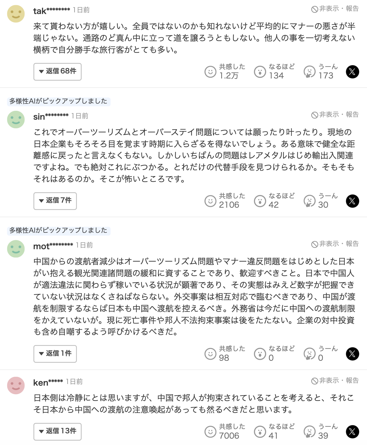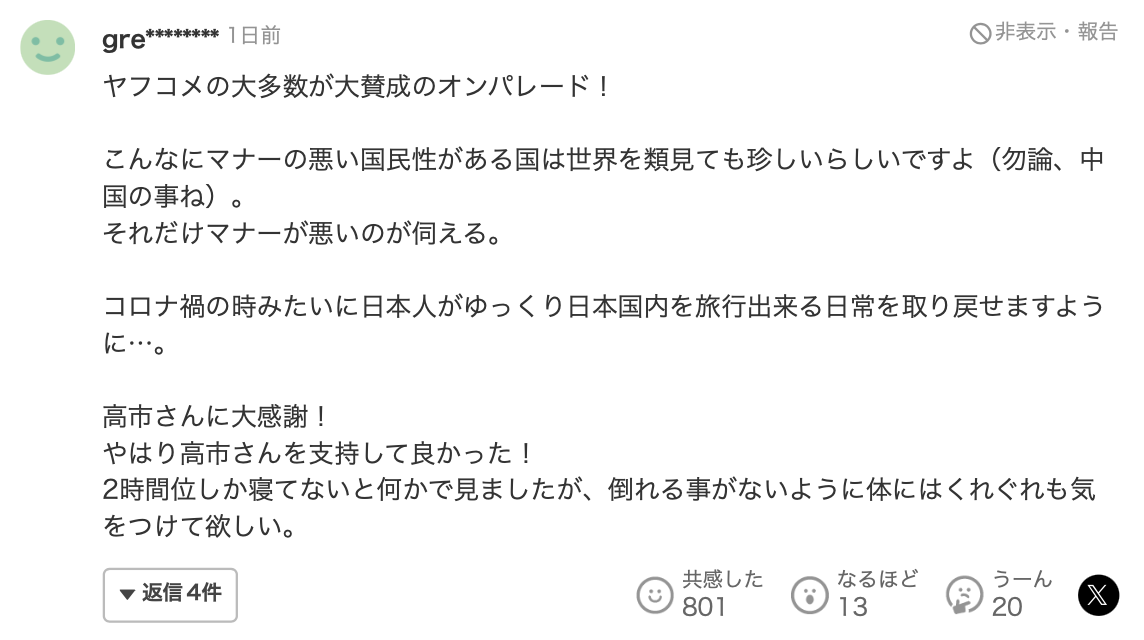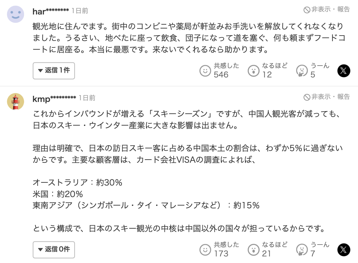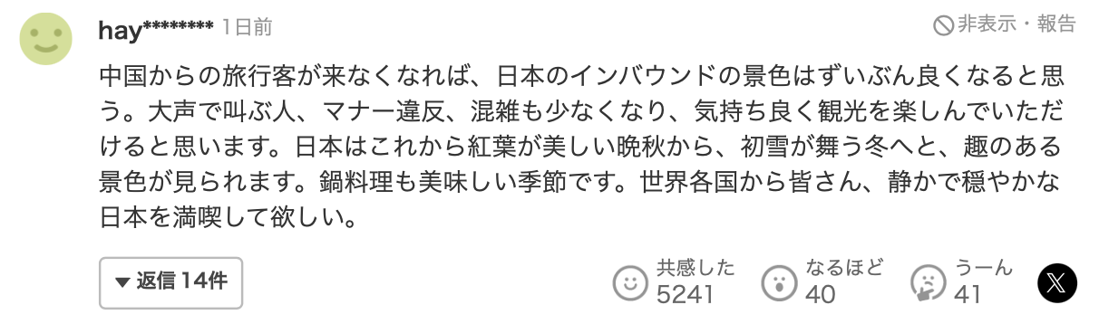 この影響で、日本に渡航する中国人旅行客が大幅に減少するとみられており、ネット上では「来て貰わない方が嬉しい。全員ではないのかも知れないけど平均的にマナーの悪さが半端じゃない。通路のど真ん中に立って道を譲ろうともしない。他人の事を一切考えない横柄で自分勝手な旅行客がとても多い」「これでオーバーツーリズムとオーバーステイ問題については願ったり叶ったり」「中国からの旅行客が来なくなれば、日本のインバウンドの景色はずいぶん良くなると思う」「ヤフコメの大多数が大賛成のオンパレード!」といった声が多数上がっています。