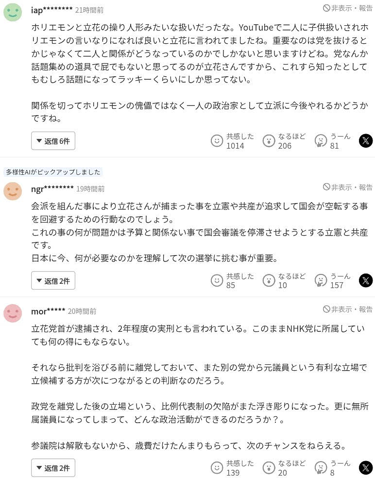 斉藤健一郎は、ガーシー(本名:東谷義和)元参院議員が除名になったことで繰り上げ当選した経緯があるため、ネット上では「元々がガーシー枠での繰り上げ当選。NHK党に所属していたから、今の地位がある。離党したなら本来は議員辞職が筋です」「NHK党の名前で議席をもらい、これまで仕事をしていたのだから、NHK党を離党するのであれば議員辞職をすべきなんじゃないの?」といった厳しい批判の声が上がっています。